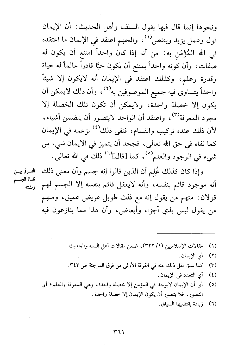 ونحوها إنما قال فيها بقول أهل السلف وأهل الحديث أن الإيمان قول وعمل يزيد وينقص والجهم اعتقد في الإيمان ما اعتقده في الله المُؤْمَنِ به من أنه إذا كان واحداً امتنع أن يكون له صفات وأن كونه واحداً يمتنع أن يكون حيًّا قادراً عالماً له حياة وقدرة وعلم وكذلك اعتقد في الإيمان أنه لايكون إلا شيئاً واحداً يتساوى فيه جميع الموصوفين به وأن ذلك لايمكن أن يكون إلا خصلة واحدة ولايمكن أن تكون تلك الخصلة إلا مجرد المعرفة واعتقد أن الواحد لايتصور أن يتضمن أشياء لأن ذلك عنده تركيب وانقسام فنفى ذلك بزعمه في الإيمان كما نفاه في حق الله تعالى فجحد أن يتميز في الإيمان شيء من شيء في الوجود والعلم كما قال ذلك في الله تعالى وإذا كان كذلك عُلِم أن الذين قالوا إنه جسم وأن معنى ذلك أنه موجود قائم بنفسه وأنه لايعقل قائم بنفسه إلا الجسم لهم قولان منهم من يقول إنه مع ذلك طويل عريض عميق ومنهم من يقول ليس بذي أجزاء وأبعاض وأن هذا مما ينازعون فيه