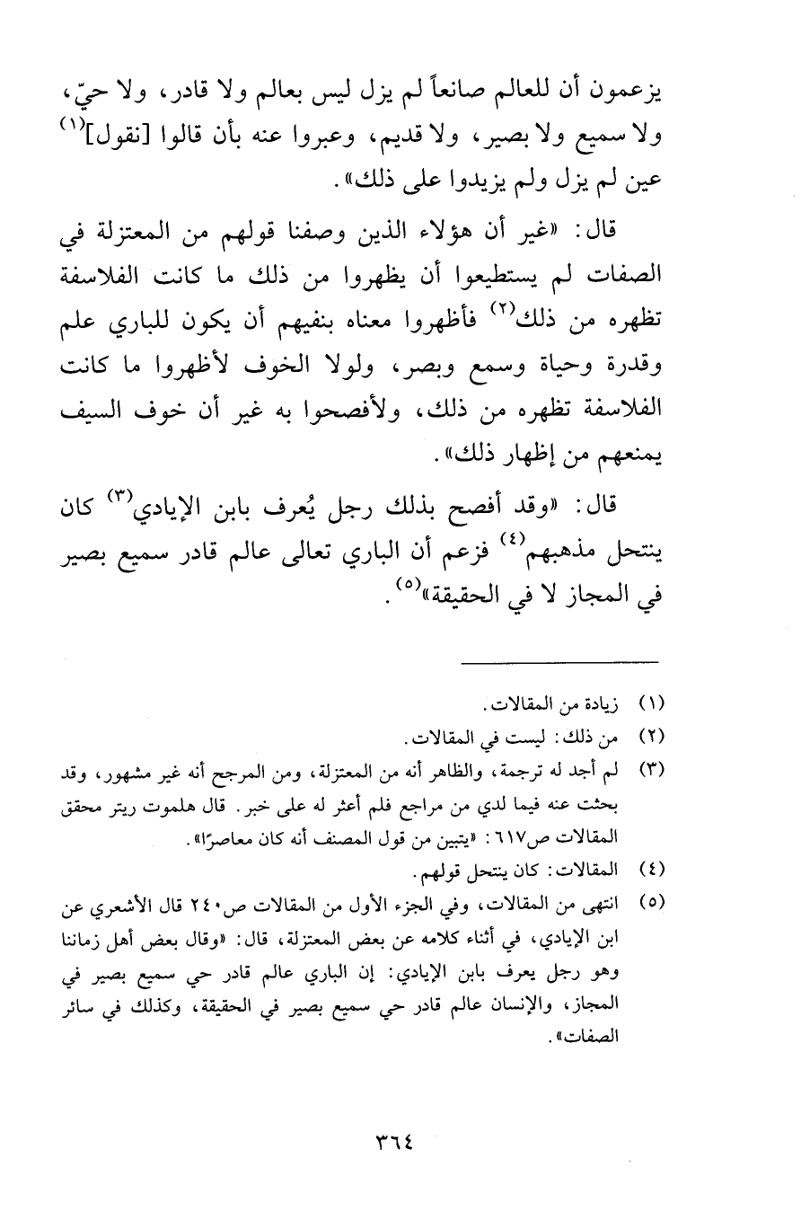 يزعمون أن للعالم صانعاً لم يزل ليس بعالم ولا قادر ولا حيّ ولا سميع ولا بصير ولا قديم وعبروا عنه بأن قالوا نقول عين لم يزل ولم يزيدوا على ذلك قال غير أن هؤلاء الذين وصفنا قولهم من المعتزلة في الصفات لم يستطيعوا أن يظهروا من ذلك ما كانت الفلاسفة تظهره من ذلك فأظهروا معناه بنفيهم أن يكون للباري علم وقدرة وحياة وسمع وبصر ولولا الخوف لأظهروا ما كانت الفلاسفة تظهره من ذلك ولأفصحوا به غير أن خوف السيف يمنعهم من إظهار ذلك قال وقد أفصح بذلك رجل يُعرف بابن الإيادي كان ينتحل مذهبهم فزعم أن الباري تعالى عالم قادر سميع بصير في المجاز لا في الحقيقة