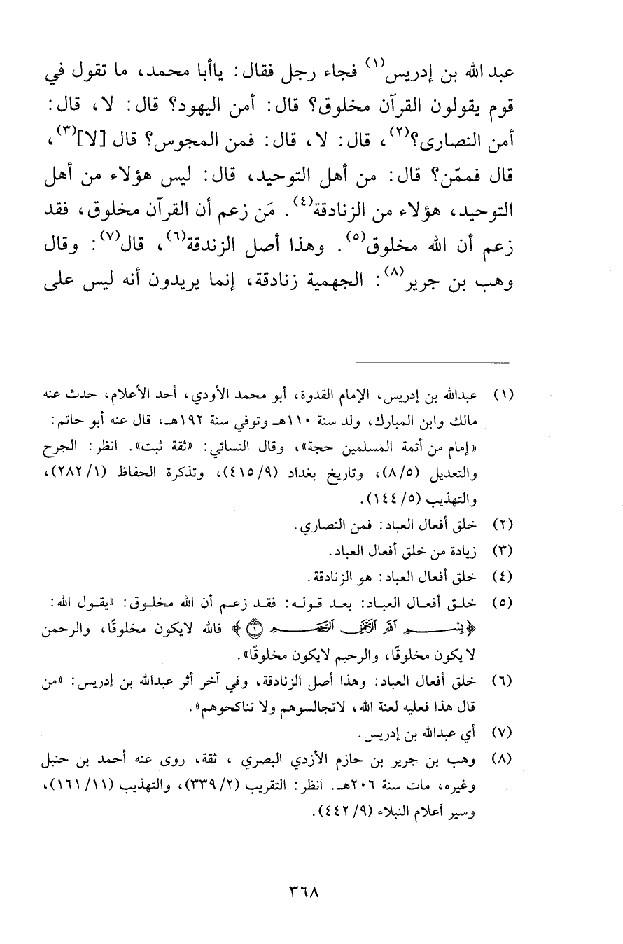 عبد الله بن إدريس فجاء رجل فقال ياأبا محمد ما تقول في قوم يقولون القرآن مخلوق قال أمن اليهود قال لا قال أمن النصارى قال لا قال فمن المجوس قال لا قال فممّن قال من أهل التوحيد قال ليس هؤلاء من أهل التوحيد هؤلاء من الزنادقة مَن زعم أن القرآن مخلوق فقد زعم أن الله مخلوق وهذا أصل الزندقة قال وقال وهب بن جرير الجهمية زنادقة إنما يريدون أنه ليس على