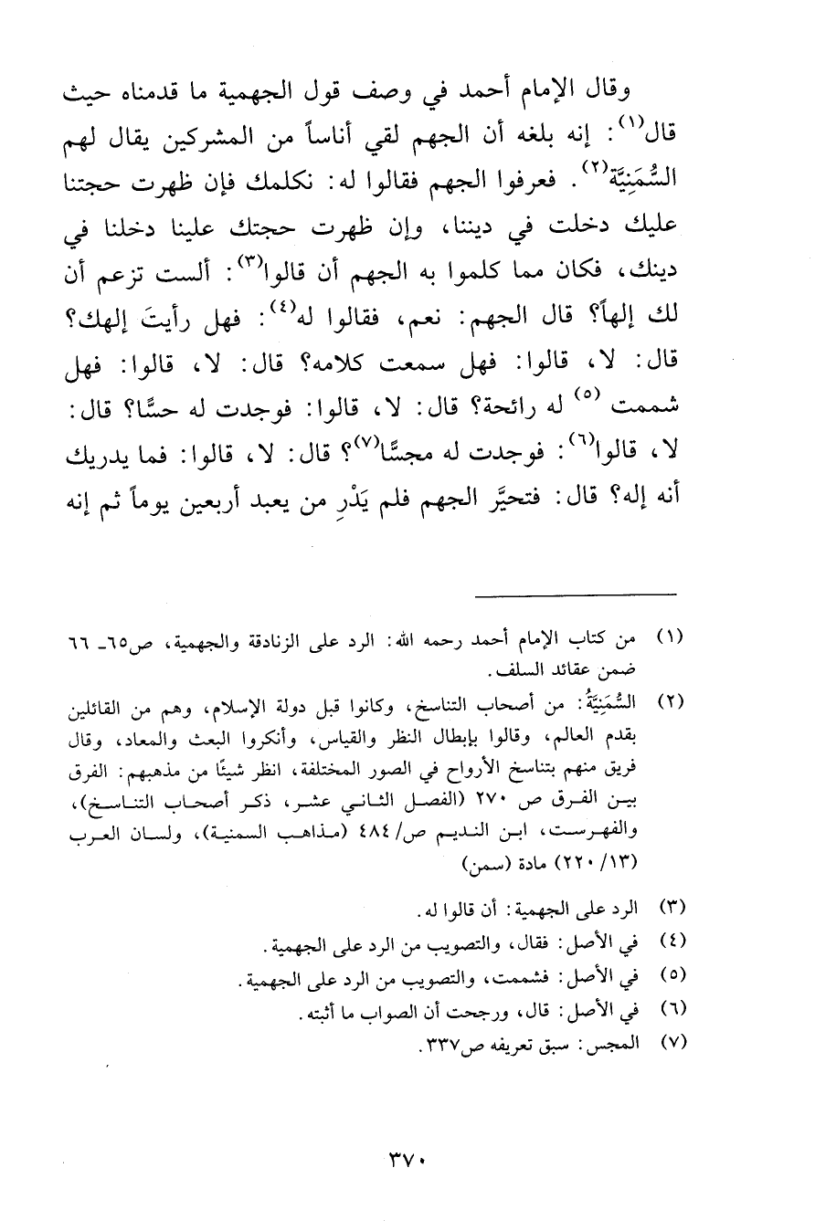 وقال الإمام أحمد في وصف قول الجهمية ما قدمناه حيث قال إنه بلغه أن الجهم لقي أناساً من المشركين يقال لهم السُّمَنِيَّة فعرفوا الجهم فقالوا له نكلمك فإن ظهرت حجتنا عليك دخلت في ديننا وإن ظهرت حجتك علينا دخلنا في دينك فكان مما كلموا به الجهم أن قالوا ألست تزعم أن لك إلهاً قال الجهم نعم فقالوا له فهل رأيتَ إلهك قال لا قالوا فهل سمعت كلامه قال لا قالوا فهل شممت له رائحة قال لا قالوا فوجدت له حسًّا قال لا قالوا فوجدت له مجسًّا قال لا قالوا فما يدريك أنه إله قال فتحيَّر الجهم فلم يَدْرِ من يعبد أربعين يوماً ثم إنه