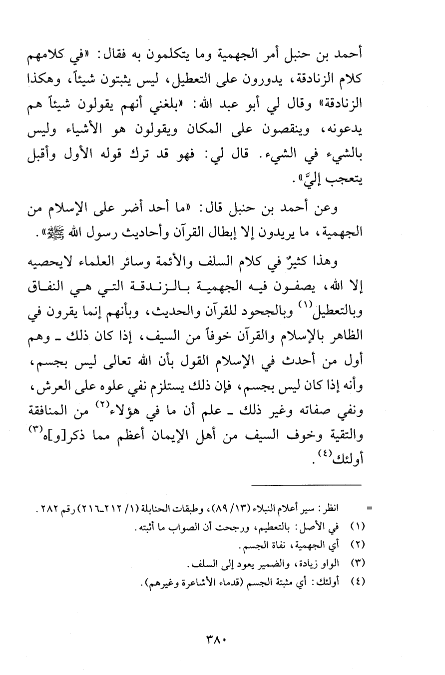 أحمد بن حنبل أمر الجهمية وما يتكلمون به فقال في كلامهم كلام الزنادقة يدورون على التعطيل ليس يثبتون شيئاً وهكذا الزنادقة وقال لي أبو عبد الله بلغني أنهم يقولون شيئاً هم يدعونه وينقصون على المكان ويقولون هو الأشياء وليس بالشيء في الشيء قال لي فهو قد ترك قوله الأول وأقبل يتعجب إليَّ وعن أحمد بن حنبل قال ما أحد أضر على الإسلام من الجهمية ما يريدون إلا إبطال القرآن وأحاديث رسول الله صلى الله عليه وسلم وهذا كثيرٌ في كلام السلف والأئمة وسائر العلماء لايحصيه إلا الله يصفون فيه الجهمية بالزندقة التي هي النفاق وبالتعطيل وبالجحود للقرآن والحديث وبأنهم إنما يقرون في الظاهر بالإسلام والقرآن خوفاً من السيف إذا كان كذلك وهم أول من أحدث في الإسلام القول بأن الله تعالى ليس بجسم وأنه إذا كان ليس بجسم فإن ذلك يستلزم نفي علوه على العرش ونفي صفاته وغير ذلك علم أن ما في هؤلاء من المنافقة والتقية وخوف السيف من أهل الإيمان أعظم مما ذكر وهـ أولئك