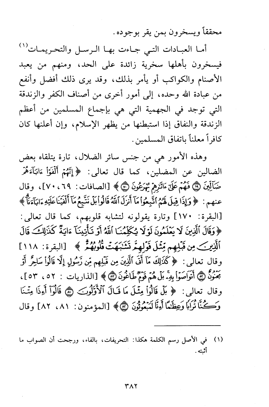 محققاً ويسخرون بمن يقر بوجوده أما العبادات التي جاءت بها الرسل والتحريمات فيسخرون بأهلها سخرية زائدة على الحد ومنهم من يعبد الأصنام والكواكب أو يأمر بذلك وقد يرى ذلك أفضل وأنفع من عبادة الله وحده إلى أمور أخرى من أصناف الكفر والزندقة التي توجد في الجهمية التي هي بإجماع المسلمين من أعظم الزندقة والنفاق إذا استبطنها من يظهر الإسلام وغن أعلنها كان كافراً معلناً باتفاق المسلمين وهذه الأمور هي من جنس سائر الضلال تارة يتلقاه بعض الضالين عن المضلين كما قال تعالى إِنَّهُمْ أَلْفَوْا آبَاءَهُمْ ضَالِّينَ (69) فَهُمْ عَلَى آثَارِهِمْ يُهْرَعُونَ (70) [الصافات 69-70] وقال عنهم وَإِذَا قِيلَ لَهُمُ اتَّبِعُوا مَا أَنْزَلَ اللَّهُ قَالُوا بَلْ نَتَّبِعُ مَا أَلْفَيْنَا عَلَيْهِ آبَاءَنَا [البقرة 170] وتارة يقولونه لتشابه قلوبهم كما قال تعالى وَقَالَ الَّذِينَ لَا يَعْلَمُونَ لَوْلَا يُكَلِّمُنَا اللَّهُ أَوْ تَأْتِينَا آيَةٌ كَذَلِكَ قَالَ الَّذِينَ مِنْ قَبْلِهِمْ مِثْلَ قَوْلِهِمْ تَشَابَهَتْ قُلُوبُهُمْ [البقرة 118] وقال تعالى كَذَلِكَ مَا أَتَى الَّذِينَ مِنْ قَبْلِهِمْ مِنْ رَسُولٍ إِلَّا قَالُوا سَاحِرٌ أَوْ مَجْنُونٌ (52) أَتَوَاصَوْا بِهِ بَلْ هُمْ قَوْمٌ طَاغُونَ (53) [الذاريات 52-53] وقال تعالى بَلْ قَالُوا مِثْلَ مَا قَالَ الْأَوَّلُونَ (81) قَالُوا أَإِذَا مِتْنَا وَكُنَّا تُرَابًا وَعِظَامًا أَإِنَّا لَمَبْعُوثُونَ (82) [المؤمنون 81-82] وقال