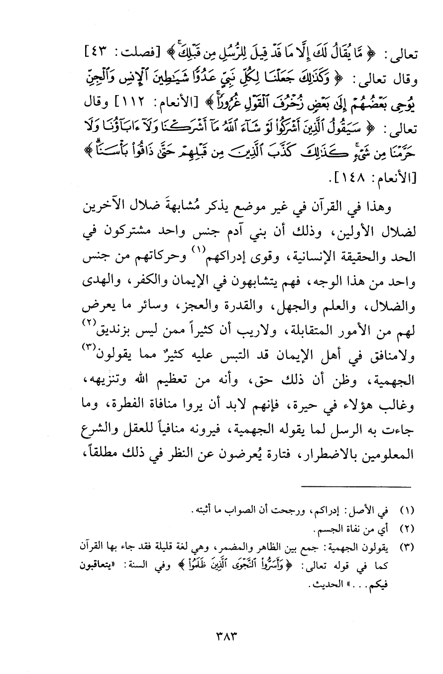 تعالى مَا يُقَالُ لَكَ إِلَّا مَا قَدْ قِيلَ لِلرُّسُلِ مِنْ قَبْلِكَ [فصلت 43] وقال تعالى وَكَذَلِكَ جَعَلْنَا لِكُلِّ نَبِيٍّ عَدُوًّا شَيَاطِينَ الْإِنْسِ وَالْجِنِّ يُوحِي بَعْضُهُمْ إِلَى بَعْضٍ زُخْرُفَ الْقَوْلِ غُرُورًا [الأنعام 112] وقال تعالى سَيَقُولُ الَّذِينَ أَشْرَكُوا لَوْ شَاءَ اللَّهُ مَا أَشْرَكْنَا وَلَا آبَاؤُنَا وَلَا حَرَّمْنَا مِنْ شَيْءٍ كَذَلِكَ كَذَّبَ الَّذِينَ مِنْ قَبْلِهِمْ حَتَّى ذَاقُوا بَأْسَنَا [الأنعام 148] وهذا في القرآن في غير موضع يذكر مُشابهةَ ضلال الآخرين لضلال الأولين وذلك أن بني آدم جنس واحد مشتركون في الحد والحقيقة الإنسانية وقوى إدراكهم وحركاتهم من جنس واحد من هذا الوجه فهم يتشابهون في الإيمان والكفر والهدى والضلال والعلم والجهل والقدرة والعجز وسائر ما يعرض لهم من الأمور المتقابلة ولاريب أن كثيراً ممن ليس بزنديق ولامنافق من أهل الإيمان قد التبس عليه كثيرٌ مما يقولون الجهمية وظن أن ذلك حق وأنه من تعظيم الله وتنزيهه وغالب هؤلاء في حيرة فإنهم لابد أن يروا منافاة الفطرة وما جاءت به الرسل لما يقوله الجهمية فيرونه منافياً للعقل والشرع المعلومين بالاضطرار فتارة يُعرضون عن النظر في ذلك مطلقاً