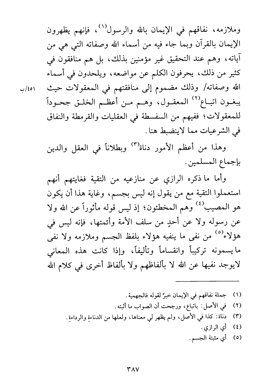 وملازمه نفاقهم في الإيمان بالله والرسول فإنهم يظهرون الإيمان بالقرآن وبما جاء فيه من أسماء الله وصفاته التي هي من آياته وهم عند التحقيق غير مؤمنين بذلك بل هم منافقون في كثير من ذلك يحرفون الكلم عن مواضعه ويلحدون في أسماء الله وصفاته وذلك مضموم إلى منافقتهم في المعقولات حيث يبغون اتباع المعقول وهم من أعظم الخلق جحوداً للمعقولات ففيهم من السفسطة في العقليات والقرمطة والنفاق في الشرعيات مما لاينضبط هنا وهذا من أعظم الأمور دناة وبطلاناً في العقل والدين بإجماع المسلمين وأما ما ذكره الرازي عن منازعيه من التقية فغايتهم أنهم استعملوا التقية مع من يقول إنه ليس بجسم وغاية هذا أن يكون هو المصيب وهم المخطئون إذ ليس قوله مأثوراً عن الله ور عن رسوله ولا عن أحدٍ من سلف الأمة وأئمتها فإنه ليس في هؤلاء من نفى ما ينفيه هؤلاء بلفظ الجسم وملازمه ولا نفى ما يسمونه تركيباً وانقساماً وتأليفاً وإذا كانت هذه المعاني لايوجد نفيها عن الله لا بألفاظهم ولا بألفاظ أخرى في كلام الله