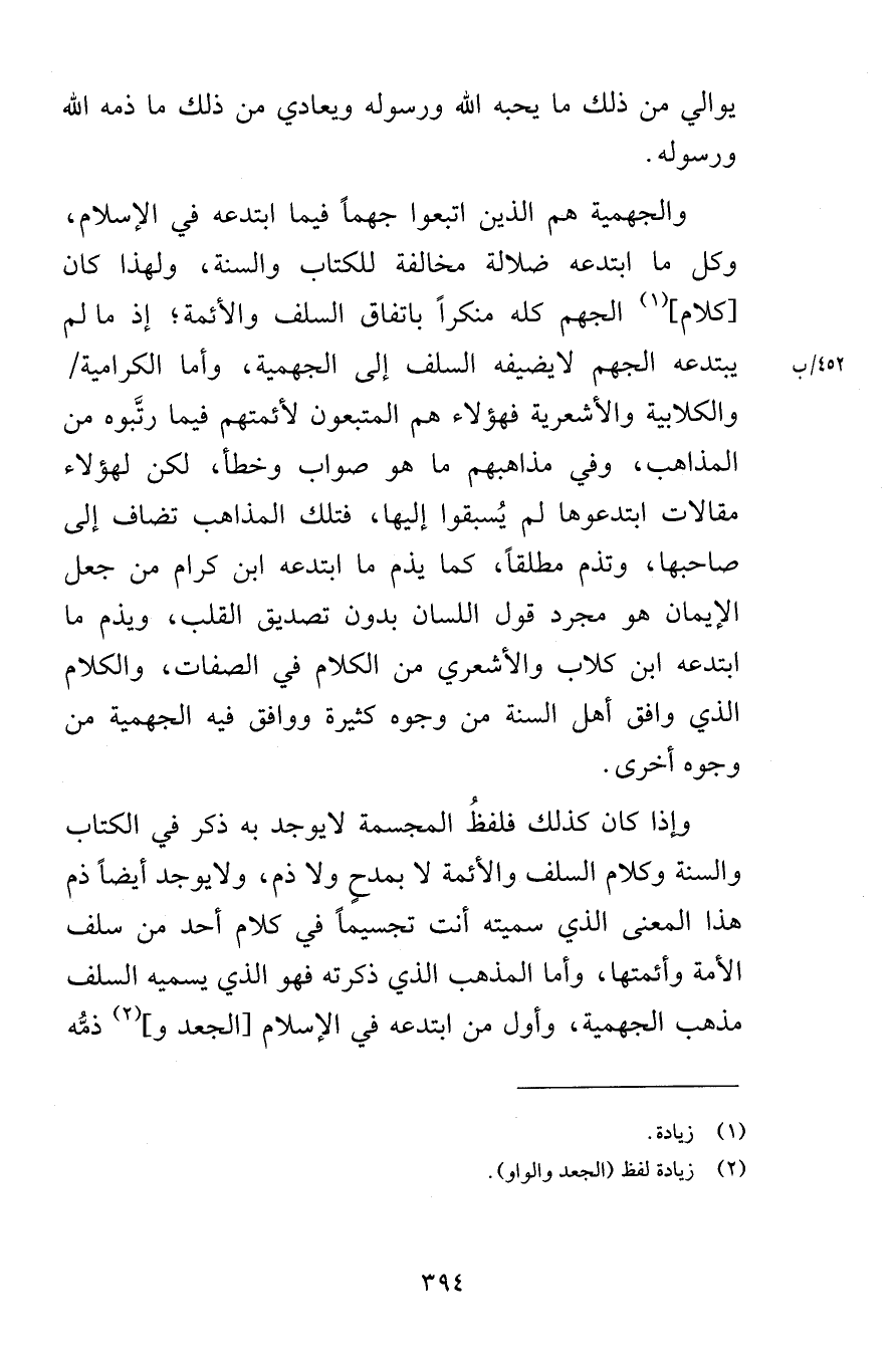 يوالي من ذلك ما يحبه الله ورسوله يعادي من ذلك ما ذمه الله ورسوله والجهمية هم الذين اتبعوا جهماً فيما ابتدعه في الإسلام وكل ما ابتدعه ضلالة مخالفة للكتاب والسنة ولهذا كان كلام الجهم كله منكراً باتفاق السلف والأئمة إذ ما لم يبتدعه الجهم لايضيفه السلف إلى الجهمية وأما الكرامية والكلابية والأشعرية فهؤلاء هم المتبعون لأئمتهم فيما رتَّبوه من المذاهب وفي مذاهبهم ما هو صواب وخطأ لكن لهؤلاء مقالات ابتدعوها لم يُسبقوا إليها فتلك المذاهب تضاف إلى صاحبها وتذم مطلقاً كما يذم ما ابتدعه ابن كرام من جعل الإيمان هو مجرد قول اللسان بدون تصديق القلب ويذم ما ابتدعه ابن كلاب والأشعري من الكلام في الصفات والكلام الذي وافق أهل السنة من وجوه كثيرة ووافق فيه الجهمية من وجوه أخرى وإذا كان كمذلك فلفظُ المجسمة لايوجد به ذكر في الكتاب والسنة وكلام السلف والأئمة لا بمدحٍ ولا ذم ولايوجد أيضاً ذم هذا المعنى الذي سميته أنت تجسيماً في كلام أحد من سلف الأمة وأئمتها وأما المذهب الذي ذكرته فهو الذي يسميه السلف مذهب الجهمية وأول من ابتدعه في الإسلام الجعد وذمُّه
