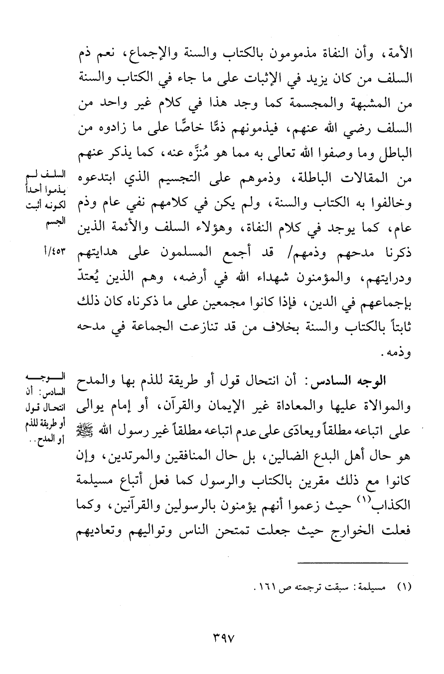 الأمة وأن النفاة مذمومون بالكتاب والسنة والإجماع نعم ذم السلف من كان يزيد في الإثبات على ما جاء في الكتاب والسنة من المشبهة والمجسمة كما وجد هذا في كلام غير واحد من السلف رضي الله عنهم فيذمونهم ذمًّا خاصًّا على ما زادوه من الباطل وما وصفوا الله تعالى به مما هو مُنزَّه عنه كما يذكر عنهم من المقالات الباطلة وذموهم على التجسيم الذي ابتدعوه وخالفوا به الكتاب والسنة ولم يكن في كلامهم نفي عام وذم عام كما يوجد في كلام النفاة وهؤلاء السلف والأئمة الذين ذكرنا مدحهم وذمهم قد أجمع المسلمون على هدايتهم ودرايتهم والمؤمنون شهداء الله في أرضه وهم الذين يُعتدّ بإجماعهم في الدين فإذا كانوا مجمعين على ما ذكرناه كان ذلك ثابتاً بالكتاب والسنة بخلاف من قد تنازعت الجماعة في مدحه وذمه الوجه السادس أن انتحال قول أو طريقة للذم بها والمدح والموالاة عليها والمعاداة غير الإيمان والقرآن أو إمام يوالى على اتباعه مطلقاً ويعادَى على عدم اتباعه مطلقاً غير رسول الله صلى الله عليه وسلم هو حال أهل البدع الضالين بل حال المنافقين والمرتدين وإن كانوا مع ذلك مقرين بالكتاب والرسول كما فعل أتباع مسيلمة الكذاب حيث زعموا أنهم يؤمنون بالرسولين والقرآنين وكما فعلت الخوارج حيث جعلت تمتحن الناس وتواليهم وتعاديهم