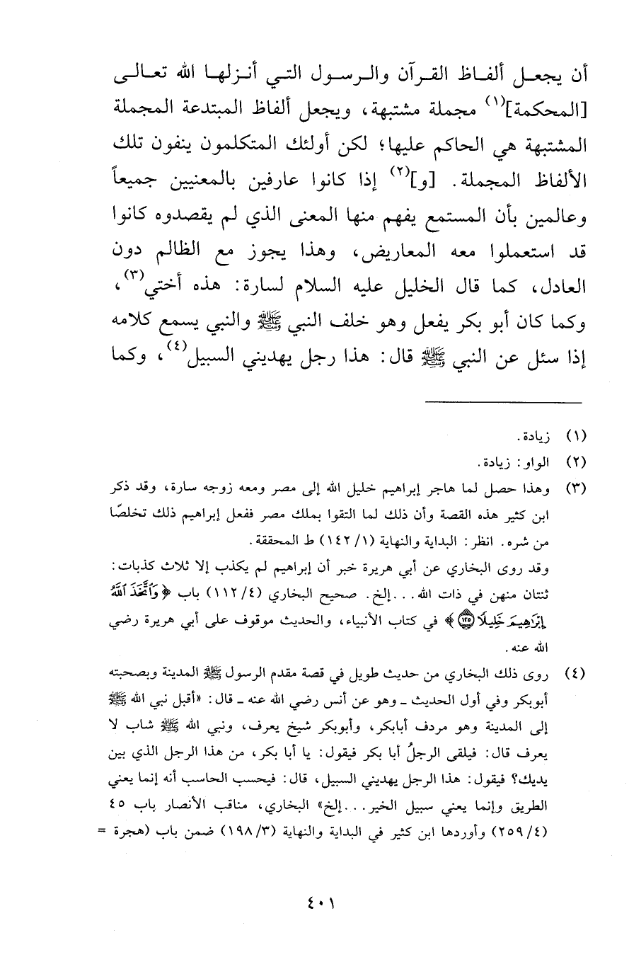 أن يجعل ألفاظ القرآن والرسول التي أنزلها الله تعالى المحكمة مجملة مشتبهة ويجعل ألفاظ المبتدعة المجملة المشتبهة هي الحاكم عليها لكن أولئك المتكلمون ينفون تلك الألفاظ المجملة وإذا كانوا عارفين بالمعنيين جميعاً وعالمين بأن المستمع يفهم منها المعنى الذي لم يقصدوه كانوا قد استعملوا معه المعاريض وهذا يجوز مع الظالم دون العادل كما قال الخليل عليه السلام لسارة هذه أختي وكما كان أبو بكر يفعل وهو خلف النبي صلى الله عليه وسلم والنبي يسمع كلامه إذا سئل عن النبي صلى الله عليه وسلم قال هذا رجل يهديني السبيل وكما