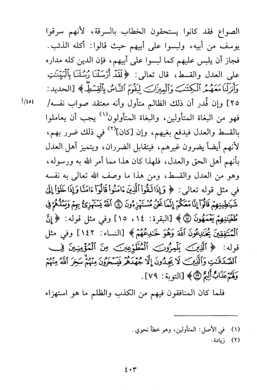 الصواع فقد كانوا يستحقون الخطاب بالسرقة لأنهم سرقوا يوسف من أبيه ولبسوا على أبيهم فإن الدين كله مداره على العدل والقسط قال تعالى لَقَدْ أَرْسَلْنَا رُسُلَنَا بِالْبَيِّنَاتِ وَأَنْزَلْنَا مَعَهُمُ الْكِتَابَ وَالْمِيزَانَ لِيَقُومَ النَّاسُ بِالْقِسْطِ [الحديد 25] وإن قُدر أن ذلك الظالم متأول وأنه معتقد صواب نفسه فهو من البغاة المتأولين والبغاة المتأولون يجب أن يعاملوا بالقسط والعدل فيدفع بغيهم وإن كان في ذلك ضرر بهم لأنهم أيضاً يضرون غيرهم فيتقابل الضرران ويتميز أهل العدل بأنهم أهل الحق والعدل فلهذا كان هذا مما أمر الله به ورسوله وهو من العدل والقسط ومن هذا ما وصف الله تعالى به نفسه في مثل قوله تعالى وَإِذَا لَقُوا الَّذِينَ آمَنُوا قَالُوا آمَنَّا وَإِذَا خَلَوْا إِلَى شَيَاطِينِهِمْ قَالُوا إِنَّا مَعَكُمْ إِنَّمَا نَحْنُ مُسْتَهْزِئُونَ (14) اللَّهُ يَسْتَهْزِئُ بِهِمْ وَيَمُدُّهُمْ فِي طُغْيَانِهِمْ يَعْمَهُونَ (15) [البقرة 14-15] وفي مثل قوله إِنَّ الْمُنَافِقِينَ يُخَادِعُونَ اللَّهَ وَهُوَ خَادِعُهُمْ [النساء 142] وفي مثل قوله الَّذِينَ يَلْمِزُونَ الْمُطَّوِّعِينَ مِنَ الْمُؤْمِنِينَ فِي الصَّدَقَاتِ وَالَّذِينَ لَا يَجِدُونَ إِلَّا جُهْدَهُمْ فَيَسْخَرُونَ مِنْهُمْ سَخِرَ اللَّهُ مِنْهُمْ وَلَهُمْ عَذَابٌ أَلِيمٌ (79) [التوبة 79] فلما كان المنافقون فيهم من الكذب والظلم ما هو استهزاء