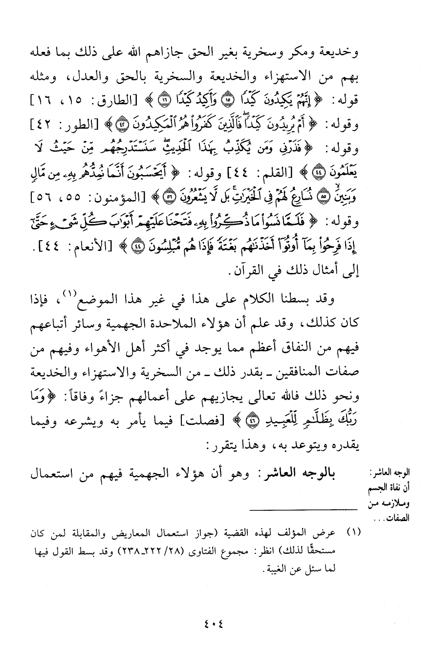 وخديعة ومكر وسخرية بغير الحق جازاهم الله على ذلك بما فعله بهم من الاستهزاء والخديعة والسخرية بالحق والعدل ومثله قوله إِنَّهُمْ يَكِيدُونَ كَيْدًا (15) وَأَكِيدُ كَيْدًا (16) [الطارق 15-16] وقوله أَمْ يُرِيدُونَ كَيْدًا فَالَّذِينَ كَفَرُوا هُمُ الْمَكِيدُونَ (42) [الطور 42] وقوله فَذَرْنِي وَمَنْ يُكَذِّبُ بِهَذَا الْحَدِيثِ سَنَسْتَدْرِجُهُمْ مِنْ حَيْثُ لَا يَعْلَمُونَ (44) [القلم 44] وقوله أَيَحْسَبُونَ أَنَّمَا نُمِدُّهُمْ بِهِ مِنْ مَالٍ وَبَنِينَ (55) نُسَارِعُ لَهُمْ فِي الْخَيْرَاتِ بَلْ لَا يَشْعُرُونَ (56) [المؤمنون 55-56] وقوله فَلَمَّا نَسُوا مَا ذُكِّرُوا بِهِ فَتَحْنَا عَلَيْهِمْ أَبْوَابَ كُلِّ شَيْءٍ حَتَّى إِذَا فَرِحُوا بِمَا أُوتُوا أَخَذْنَاهُمْ بَغْتَةً فَإِذَا هُمْ مُبْلِسُونَ (44) [الأنعام 44] إلى أمثال ذلك في القرآن وقد بسطنا الكلام على هذا في غير هذا الموضع فإذا كان كذلك وقد علم أن هؤلاء الملاحدة الجهمية وسائر أتباعهم فيهم من النفاق أعظم مما يوجد في أكثر أهل الأهواء وفيهم من صفات المنافقين بقدر ذلك من السخرية والاستهزاء والخديعة ونحو ذلك فالله تعالى يجازيهم على أعمالهم جزاءً وفاقاً وَمَا رَبُّكَ بِظَلَّامٍ لِلْعَبِيدِ (46) [فصلت] فيما يأمر به ويشرعه وفيما يقدره ويتوعد به وهذا يتقرر بالوجه العاشر وهو أن هؤلاء الجهمية فيهم من استعمال