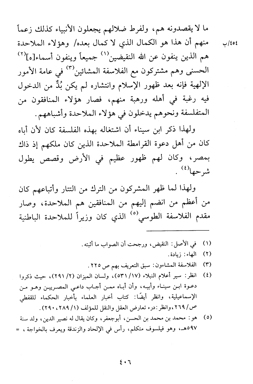 ما لا يقصدونه هم ولفرط ضلالهم يجعلون الأنبياء كذلك زعماً منهم أن هذا هو الكمال الذي لا كمال بعده وهؤلاء الملاحدة هم الذين ينفون عن الله النقيضين جميعاً وينفون أسماء هـ الحسنى وهم مشتركون مع الفلاسفة المشائين في عامة الأمور الإلهية فإنه بعد ظهور الإسلام وانتشاره لم يكن بُدٌّ من الدخول فيه رغبة في أهله ورهبة منهم فصار هؤلاء المنافقون من المتفلسفة ونحوهم يدخلون في هؤلاء الملاحدة وأشباههم ولهذا ذكر ابن سيناء اشتغاله بهذه الفلسفة كان لأن أباه كان من أهل دعوة القرامطة الملاحدة الذين كان ملكهم إذ ذاك بمصر وكان لهم ظهور عظيم في الأرض وقصص يطول شرحها ولهذا لما ظهر المشركون من الترك من التتار وأتباعهم كان من أعظم من انضم إليهم من المنافقين هم الملاحدة وصار مقدم الفلاسفة الطوسي الذي كان وزيراً للملاحدة الباطنية