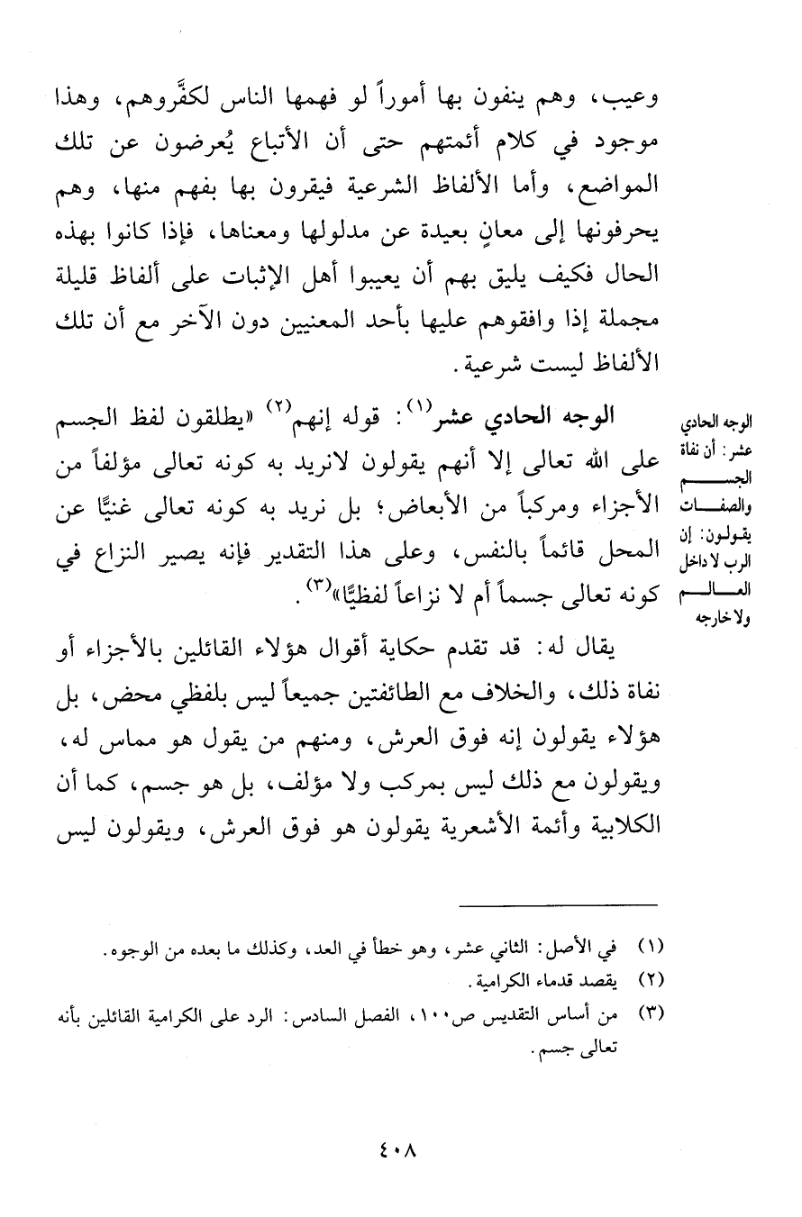 وعي وهم ينفون بها أموراً لو فهمها الناس لكفَّروهم وهذا موجود في كلام أئمتهم حتى أن الأتباع يُعرضون عن تلك المواضع وأما الألفاظ الشرعية فيقرون بها بفهم منها وهم يحرفونها إلى معانٍ بعيدة عن مدلولها ومعناها فإذا كانوا بهذه الحال فكيف يليق بهم أن يعيبوا أهل الإثبات على ألفاظ قليلة مجملة إذا وافقوهم عليها بأحد المعنيين دون الآخر مع أن تلك الألفاظ ليست شرعية الوجه الحادي عشر قوله أنهم يطلقون لفظ الجسم على الله تعالى إلا أنهم يقولون لانريد به كونه تعالى مؤلفاً من الأجزاء ومركباً من الأبعاض بل نريد به كونه تعالى غنيًّا عن المحل قائماً بالنفس وعلى هذا التقدير فإنه يصير النزاع في كونه تعالى جسماً أم لا نزاعاً لفظيًّا يقال له قد تقدم حكاية أقوال هؤلاء القائلين بالأجزاء أو نفاة ذلك والخلاف مع الطائفتين جميعاً ليس بلفظي محض بل هؤلاء يقولون إنه فوق العرش ومنهم من يقول هو مماس له ويقولون مع ذلك ليس بمركب ولا مؤلف بل هو جسم كما أن الكلابية وأئمة الأشعرية يقولون هو فوق العرش ويقولون ليس