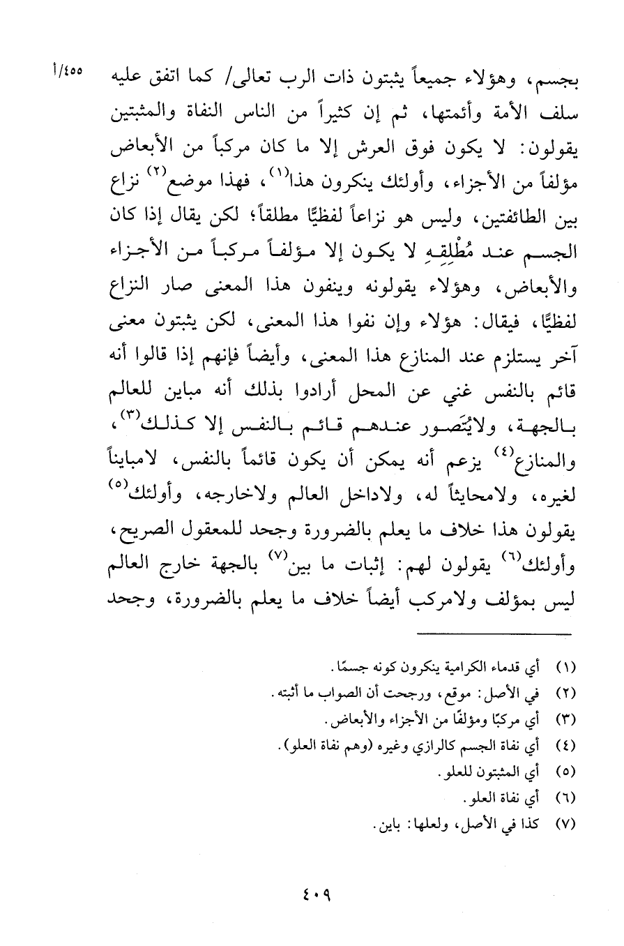 بجسم وهؤلاء جميعاً يثبتون ذات الرب تعالى كما اتفق عليه سلف الأمة وأئمتها ثم إن كثيراً من الناس النفاة والمثبتين يقولون لا يكون فوق العرش إلا ما كان مركباً من الأبعاض مؤلفاً من الأجزاء وأولئك ينكرون هذا فهذا موضع نزاع بين الطائفتين وليس هو نزاعاً لفظيًّا مطلقاً لكن يقال إذا كان الجسم عند مُطْلِقِهِ لا يكون إلا مؤلفاً مركباً من الأجزاء والأبعاض وهؤلاء يقولونه وينفون هذا المعنى صار النزاع لفظيًّا فيقال هؤلاء وإن نفوا هذا المعنى لكن يثبتون معنى آخر يستلزم عند المنازع هذا المعنى وأيضاً فإنهم إذا قالوا أنه قائم بالنفس غني عن المحل أرادوا بذلك أنه مباين للعالم بالجهة ولايُتَصور عندهم قائم بالنفس إلا كذلك والمنازع يزعم أنه يمكن أن يكون قائماً بالنفس لامبايناً لغيره ولامحايثاً له ولاداخل العالم ولاخارجه وأولئك يقولون هذا خلاف ما يعلم بالضرورة وجحد للمعقول الصريح وأولئك يقولون لهم إثبات ما بين بالجهة خارج العالم ليس بمؤلف ولامركب أيضاً خلاف ما يعلم بالضرورة وجحد