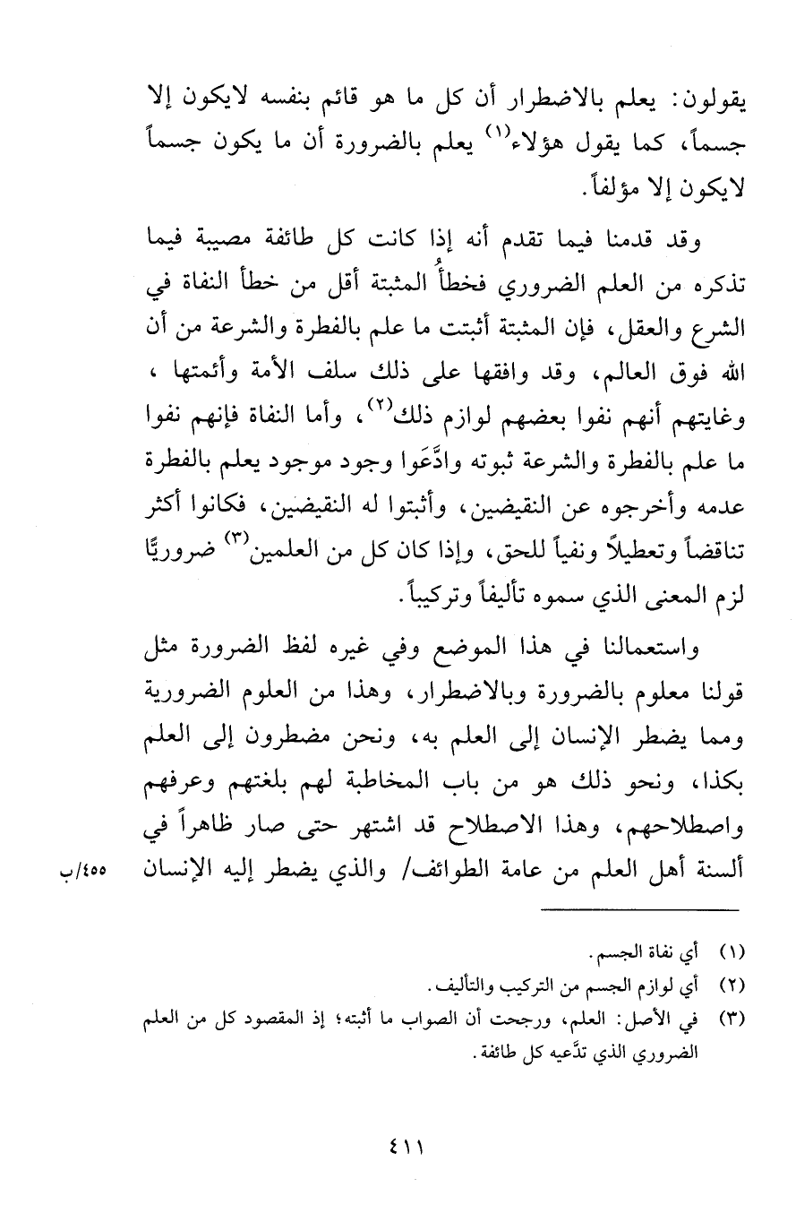 يقولون يعلم بالاضطرار أن كل ما هو قائم بنفسه لايكون إلا جسماً كما يقول هؤلاء يعلم بالضرورة أن ما يكون جسماً لايكون إلا مؤلفاً وقد قدمنا فيما تقدم أنه إذا كانت كل طائفة مصيبة فيما تذكره من العلم الضروري فخطأُ المثبتة أقل من خطأ النفاة في الشرع والعقل فإن المثبتة أثبتت ما علم بالفطرة والشرعة من أن الله فوق العالم وقد وافقها على ذلك سلف الأمة وأئمتها وغايتهم أنهم نفوا بعضهم لوازم ذلك وأما النفاة فإنهم نفوا ما علم بالفطرة والشرعة ثبوته وادَّعَوا وجود موجود يعلم بالفطرة عدمه وأخرجوه عن النقيضين وأثبتوا له النقيضين فكانوا أكثر تناقضاً وتعطيلاً ونفياً للحق وإذا كان كل من العلمين ضروريًّا لزم المعنى الذي سموه تأليفاً وتركيباً واستعمالنا في هذا الموضع وفي غيره لفظ الضرورة مثل قولنا معلوم بالضرورة وبالاضطرار وهذا من العلوم الضرورية ومما يضطر الإنسان إلى العلم به ونحن مضطرون إلى العلم بكذا ونحو ذلك من باب المخاطبة لهم بلغتهم وعرفهم واصطلاحهم وهذا الاصطلاح قد اشتهر حتى صار ظاهراً في ألسنة أهل العلم من عامة الطوائف والذي يضطر إليه الإنسان
