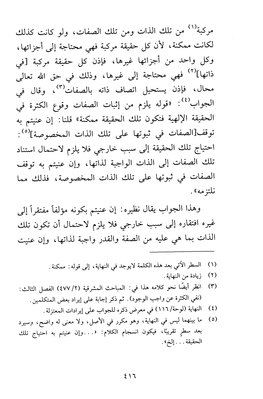 مركبة من تلك الذوات ومن تلك الصفات ولو كانت كذلك لكانت ممكنة لأن كل حقيقة مركبة فهي محتاجة إلى أجزائها وكل واحد من أجزائها غيرها فإذن كل حقيقة مركبة في ذاتها فهي محتاجة إلى غيرها وذلك في حق الله تعالى محال فإذن يستحيل اتصاف ذاته بالصفات وقال في الجواب قوله يلزم من إثبات الصفات وقوع الكثرة في الحقيقة الإلهية فتكون تلك الحقيقة ممكنة قلنا إن عنيتم به توقف الصفات في ثبوتها على تلك الذات المخصوصة احتياج تلك الحقيقة إلى سبب خارجي فلا يلزم لاحتمال استناد تلك الصفات إلى الذات الواجبة لذاتها وإن عنيتم به توقف الصفات في ثبوتها على تلك الذات المخصوصة فذلك مما نلتزمه وهذا الجواب يقال نظيره إن عنيتم بكونه مؤلفاً مفتقراً إلى غيره افتقاره إلى سبب خارجي فلا يلزم لاحتمال أن تكون تلك الذات بما هي عليه من الصفة والقدر الواجبة واجبة لذاتها وإن عنيت