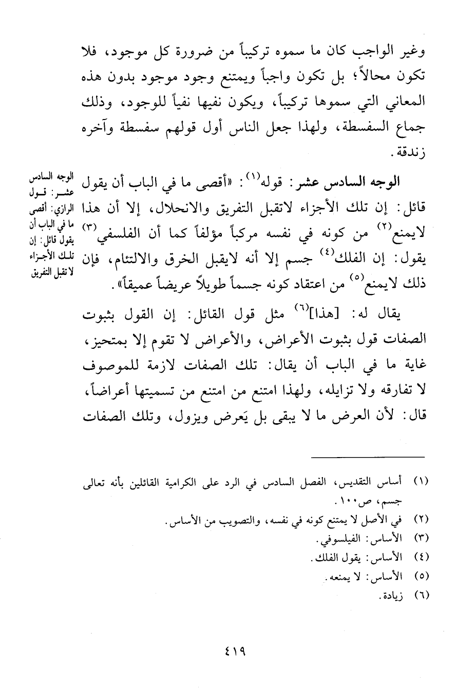 وغير الواجب كان ما سموه تركيباً من ضرورة كل موجود فلا تكون محالاً بل تكون واجباً ويمتنع وجود موجود بدون هذه المعاني التي سموها تركيباً ويكون نفيها نفياً للوجود وذلك جماع السفسطة ولهذا جعل الناس أول قولهم سفسطة وآخره زندقة الوجه السادس عشر قوله أقصى ما في الباب أن يقول قائل إن تلك الأجزاء لاتقبل التفريق والانحلال إلا أن هذا لايمنع من كونه في نفسه مركباً مؤلفاً كما أن الفلسفي يقول إن الفلك جسم إلا أنه لايقبل الخرق والالتئام فإن ذلك لايمنع من اعتقاد كونه جسماً طويلاً عريضاً عميقاً يقال له هذا مثل قول القائل إن القول بثبوت الصفات قول بثبوت الأعراض والأعراض لا تقوم إلا بمتحيز غاية ما في الباب أن يقال تلك الصفات لازمة للموصوف لا تفارقه ولا تزايله ولهذا امتنع من امتنع من تسميتها أعراضاً قال لأن العرض ما لا يبقى بل يَعرض ويزول وتلك الصفات