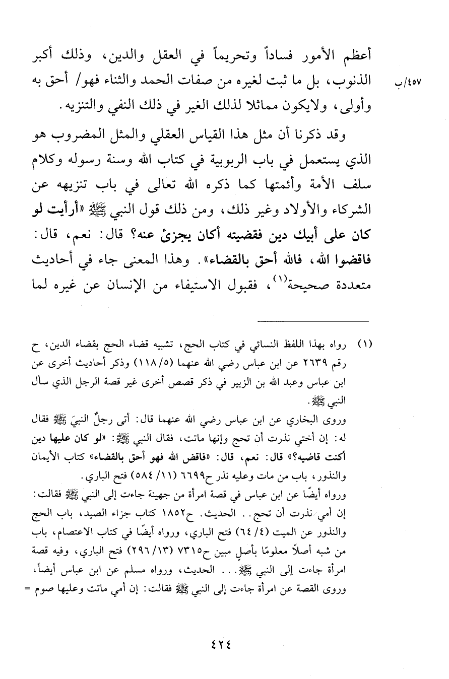 أعظم الأمور فساداً وتحريماً في العقل والدين وذلك أكبر الذنوب بل ما ثبت لغيره من صفات الحمد والثناء فهو أحق به وأولى ولايكون مماثلا لذلك الغير في ذلك النفي والتنزيه وفد ذكرنا أن مثل هذا القياس العقلي والمثل المضروب هو الذي يستعمل في باب الربوبية في كتاب الله تعالى في باب التنزيه عن الشركاء والأولاد وغير ذلك ومن ذلك قول النبي صلى الله عليه وسلم أرأيت لو كان على أبيك دين فقضيته أكان يجزئ عنه قال نعم قال فاقضوا الله فالله أحق بالقضاء وهذا المعنى جاء في أحاديث متعددة صحيحة فقبول الاستيفاء من الإنسان عن غيره لما