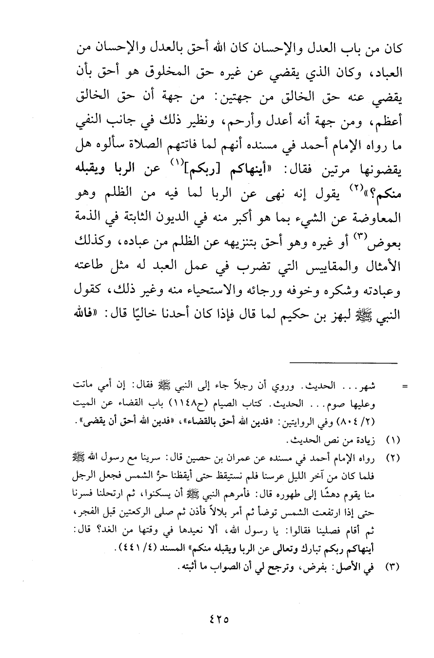 كان من باب العدل والإحسان كان الله أحق بالعدل والإحسان من العباد وكان الذي يقضي عن غيره حق المخلوق هو أحق بأن يقضي عنه حق الخالق من جهتين من جهة أن حق الخالق أعظم ومن جهة أنه أعدل وأرحم ونظير ذلك في جانب النفي ما رواه الإمام أحمد في مسنده أنهم لما فاتتهم الصلاة سألوه هل يقضونها مرتين فقال أينهاكم ربكم عن الربا ويقبله منكم يقول إنه نهى عن الربا لما فيه من الظلم وهو المعاوضة عن الشيء بما هو أكبر منه في الديون الثابتة في الذمة بعوض أو غيره وهو أحق بتنزيهه عن الظلم من عباده وكذلك الأمثال والمقاييس التي تضرب في عمل العبد له مثل طاعته وعبادته وشكره وخوفه ورجائه والاستحياء منه وغير ذلك كقول النبي صلى الله عليه وسلم لبهز بن حكيم لما قال فإذا كان أحدنا خاليًا قال فالله
