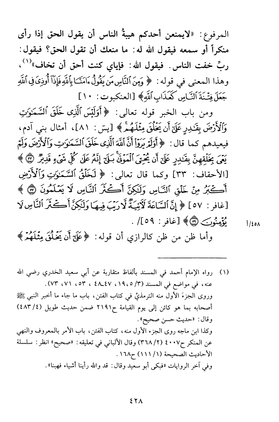 المرفوع لايمنعن أحدكم هيبةُ الناس أن يقول الحق إذا رأى منكراً أو سمعه فيقول الله له ما منعك أن تقول الحق فيقول ربِّ خفت الناس فيقول الله فإياي كنت أحق أن تخاف وهذا المعنى في قوله وَمِنَ النَّاسِ مَنْ يَقُولُ آمَنَّا بِاللَّهِ فَإِذَا أُوذِيَ فِي اللَّهِ جَعَلَ فِتْنَةَ النَّاسِ كَعَذَابِ اللَّهِ [العنكبوت 10] ومن باب الخبر قوله تعالى أَوَلَيْسَ الَّذِي خَلَقَ السَّمَاوَاتِ وَالْأَرْضَ بِقَادِرٍ عَلَى أَنْ يَخْلُقَ مِثْلَهُمْ [يس 81] أمثال بني آدم فيعيدهم كما قال أَوَلَمْ يَرَوْا أَنَّ اللَّهَ الَّذِي خَلَقَ السَّمَاوَاتِ وَالْأَرْضَ وَلَمْ يَعْيَ بِخَلْقِهِنَّ بِقَادِرٍ عَلَى أَنْ يُحْيِيَ الْمَوْتَى بَلَى إِنَّهُ عَلَى كُلِّ شَيْءٍ قَدِيرٌ (33) [الأحقاف 33] وكما قال تعالى لَخَلْقُ السَّمَاوَاتِ وَالْأَرْضِ أَكْبَرُ مِنْ خَلْقِ النَّاسِ وَلَكِنَّ أَكْثَرَ النَّاسِ لَا يَعْلَمُونَ (57) [غافر 57] إِنَّ السَّاعَةَ لَآتِيَةٌ لَا رَيْبَ فِيهَا وَلَكِنَّ أَكْثَرَ النَّاسِ لَا يُؤْمِنُونَ (59) [غافر 59] وأما ظن من ظن كالرازي أن قوله عَلَى أَنْ يَخْلُقَ مِثْلَهُمْ