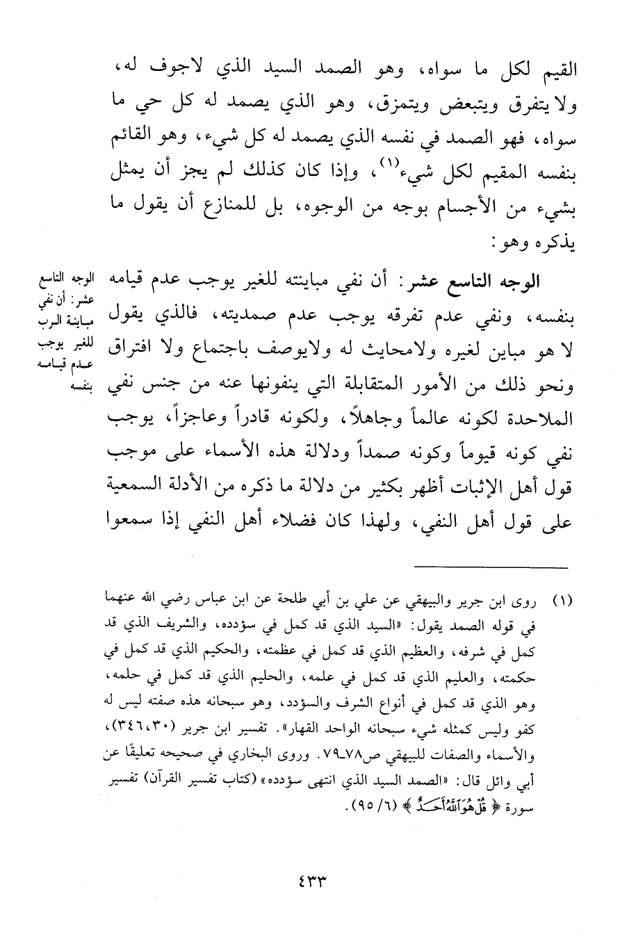 القيم لكل ما سواه وهو الصمد السيد الذي لاجوف له ولايتفرق ويتبعض ويتمزق وهو الذي يصمد له كل حي ما سواه فهو الصمد في نفسه الذي يصمد له كل شيء وهو القائم بنفسه المقيم لكل شيء وإذا كان كذلك لم بجز أن يمثل بشيء من الأجسام بوجه من الوجوه بل للمنازع أن يقول ما يذكره وهو الوجه التاسع عشر أن نفي مباينته للغير يوجب عدم قيامه بنفسه ونفي عدم تفرقه يوجب عدم صمديته فالذي يقول لا هو مباين لغيره ولامحايث له ولايوصف باجتماع ولا افتراق ونحو ذلك من الأمور المتقابلة التي ينفونها عنه من جنس نفي الملاحدة لكونه عالماً وجاهلاً ولكونه قادراً وعاجزاً يوجب نفي كونه قيوماً وكونه صمداً ودلالة هذه السماء على موجب قول أهل الإثبات أظهر كثير من دلالة ما ذكره من الأدلة السمعية على قول أهل النفي ولهذا كان فضلاء أهل النفي إذا سمعوا