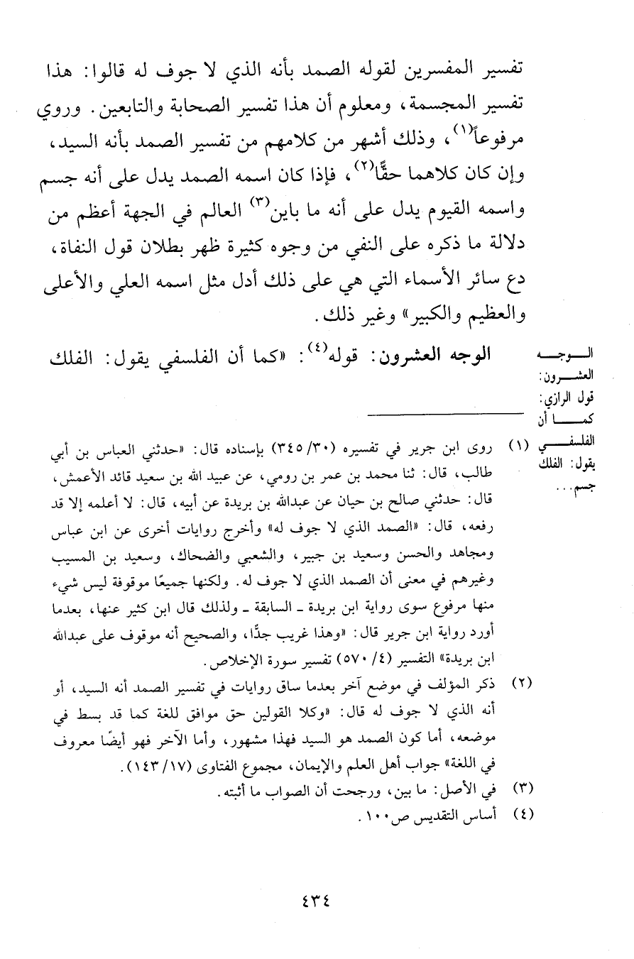 تفسير المفسرين لقوله الصمد بأنه الذي لا جوف له قالوا هذا تفسير المجسمة ومعلوم أن هذا تفسير الصحابة والتابعين وروي مرفوعاً وذلك أشهر من كلامهم من تفسير الصمد بأنه السيد وإن كان كلاهما حقًّا فإذا كان اسم الصمد يدل على أنه جسم واسمه القيوم يدل علة أنه ما باين العالم في الجهة أعظم من دلالة ما ذكره على النفي من وجوه كثيرة ظهر بطلان قول النفاة دع سائر الأسماء التي هي على ذلك أدل من اسمه العلي والأعلى والعظيم والكبير وغير ذلك الوجه العشرون قوله كما أن الفلسفي يقول الفلك