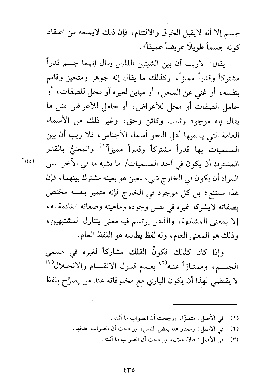 جسم إلا أنه لايقبل الخرق والالتئام فإن ذلك لايمنعه من اعتقاد كونه جسماً طويلاً عريضاً عميقاً يقال لاريب أن بين الشيئين اللذين يقال إنهما جسم قدراً مشتركاً وقدراً مميزاً وكذلك ما يقال إنه جوهر ومتحيز وقائم بنفسه أو غني عن المحل أو مباين لغيره أو محل للصفات أو حامل الصفات أو محل للأعراض أو حامل للأعراض مثل ما يقال إنه موجود وثابت وكائن وحق وغير ذلك من الأسماء العامة التي يسميها أهل النحو أسماء الأجناس فلا ريب أن بين المسميات بها قدراً مشتركاً وقدراً مميزاً والمعنيُّ بالقدر المشترك أن يكون في أحد المسميات ما يشبه ما في الآخر ليس المراد أن يكون في الخارج شيء معين هو بعينه مشترك بينهما فإن هذا ممتنع بكل موجود في الخارج فإنه متميز بنفسه مختص بصفاته لايشركه غيره في نفس وجوده وماهيته وصفاته القائمة به إلا بمعنى المشابهة والذهن يرتسم فيه معنى يتناول المشتبهين وذلك هو المعنى العام وله لفظ يطابقه وهو اللفظ العام وإذا كان كذلك فكونُ الفلك مشاركاً لغيره في مسمى الجسم وممتازاً عنه بعدم قبول الانقسام والانحلال لا يقتضي لهذا أن يكون الباري مع مخلوقاته عند من يصرِّح بلفظ