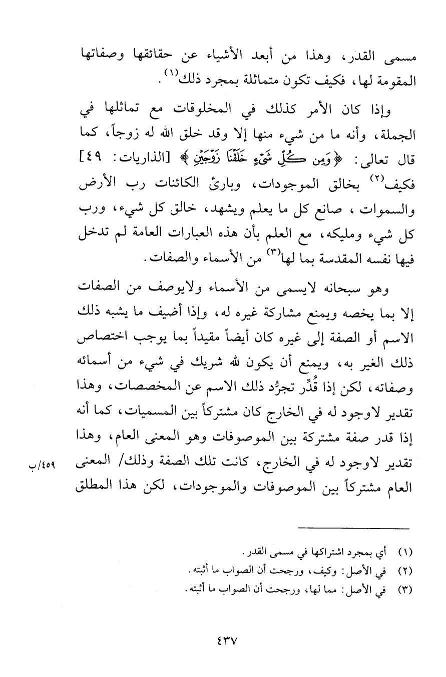 مسمى القدر وهذا من أبعد الأشياء عن حقائقها وصفاتها المقومة لها فكيف تكون متماثلة بمجرد ذلك وإذا كان الأمر كذلك في المخلوقات مع تماثلها في الجملة وأنه ما من شيء منها إلا وقد خلق الله له زوجاً كما قال تعالى وَمِنْ كُلِّ شَيْءٍ خَلَقْنَا زَوْجَيْنِ [الذاريات 49] فكيف بخالق الموجودات وبارئ الكائنات رب الأرض والسموات وصانع كل ما يعلم ويشهد خالق كل شيء ورب كل شيء ومليكه مع العلم بأن هذه العبارات العامة لم تدخل فيها نفسه المقدسة بما لها من السماء والصفات وهو سبحانه لايسمى من الأسماء ولايوصف من الصفات إلا بما يخصه ويمنع مشاركة غيره له وإذا أضيف ما يشبه ذلك الاسم أو الصفة إلى غيره كان أيضاً مقيداً بما يوجب اختصاص ذلك الغير به ويمنع أن يكون لله شريك في شيء من أسمائه وصفاته لكن إذا قُدِّر تجرُّد ذلك الاسم عن المخصصات وهذا تقدير لاوجود له في الخارج كان مشتركاً بين المسميات كما أنه إذا قدر صفة مشتركة بين الموصوفات وهو المعنى العام وهذا تقدير لاوجود له في الخارج كانت تلك الصفة وذلك المعنى العام مشتركاً بين الموصوفات والموجودات لكن هذا المطلق