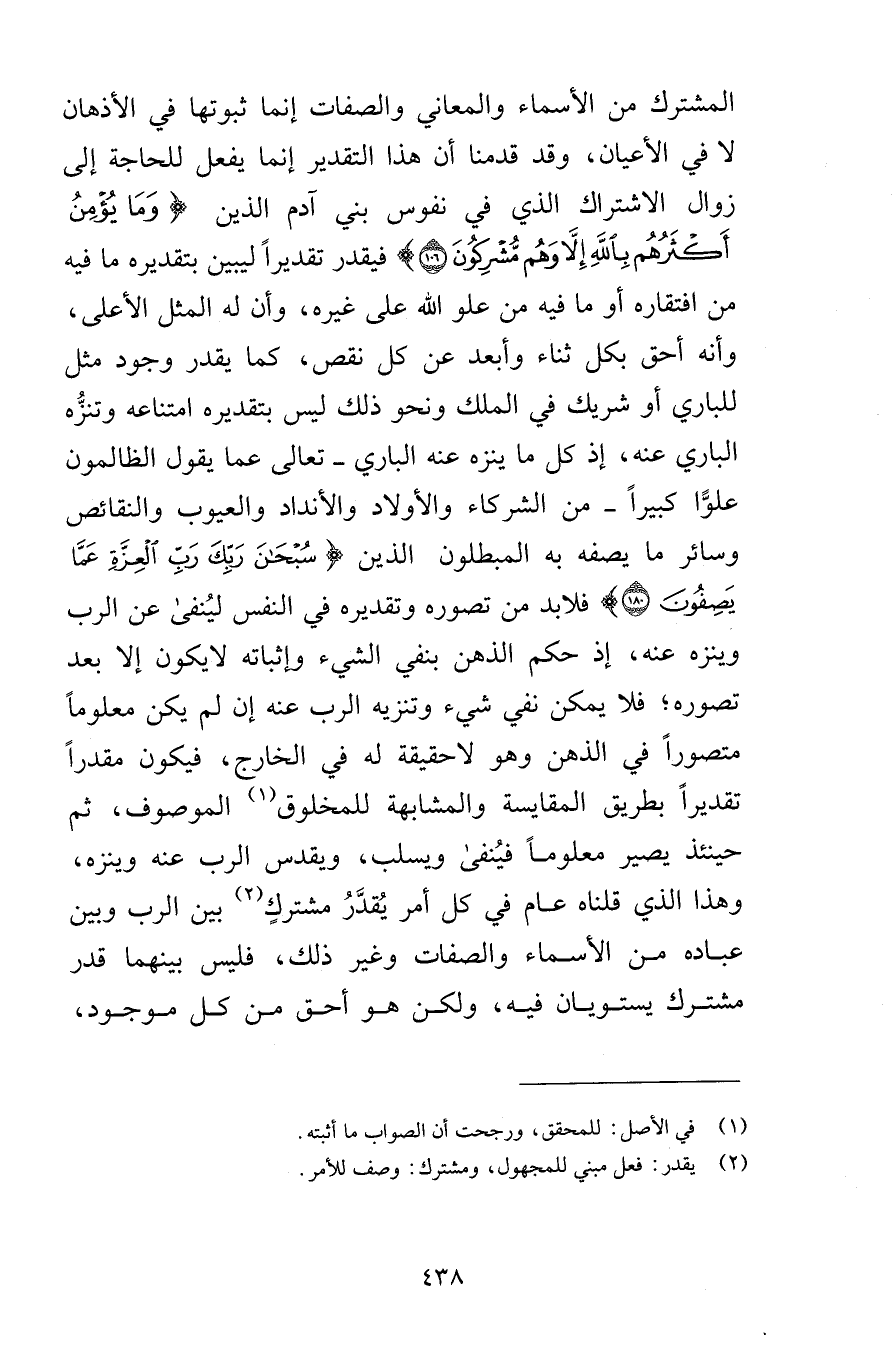 المشترك من السماء والمعاني والصفات إنما ثبوتها في الأذهان لا في الأعيان وقد قدمنا أن هذا التقدير إنما يفعل للحاجة إلى زوال الاشتراك الذي في نفوس بني آدم الذين وَمَا يُؤْمِنُ أَكْثَرُهُمْ بِاللَّهِ إِلَّا وَهُمْ مُشْرِكُونَ (106) فيقدر تقديراً ليبين بتقديره ما فيه من افتقاره أو ما فيه من علو الله على غيره وأن له المثل الأعلى وأنه أحق بكل ثناء وأبعد عن كل نقص كما يقدر وجود مثل للباري أو شريك في الملك ونحو ذلك ليس بتقديره امتناعه وتنزُّه الباري عنه إذ كل ما ينزه عنه الباري تعالى عما يقول الظالمون علوًّا كبيراً من الشركاء والأولاد والأنداد والعيوب والنقائص وسائر ما يصفه به المبطلون الذين سُبْحَانَ رَبِّكَ رَبِّ الْعِزَّةِ عَمَّا يَصِفُونَ (180) فلابد من تصوره وتقديره في النفس ليُنفى عن الرب وينزه عنه إذ حكم الذهن بنفي الشيء وإثباته لايكون إلا بعد تصوره فلا يمكن نفي شيء وتنزيه الرب عنه إن لم يكن معلوماً متصوراً في الذهن وهو لاحقيقة له في الخارج فيكون مقدراً تقديراً بطريق المقايسة والمشابهة للمخلوق الموصوف ثم حينئذ يصير معلوماً فيُنفى ويسلب ويقدس الرب عنه وينزه وهذا الذي قلناه عام في كل أمر يُقدَّرُ مشتركٍ بين الرب وبين عباده من الأسماء والصفات وغير ذلك فليس بينهما قدر مشترك يستويا فيه ولكن هو أحق من كل موجود