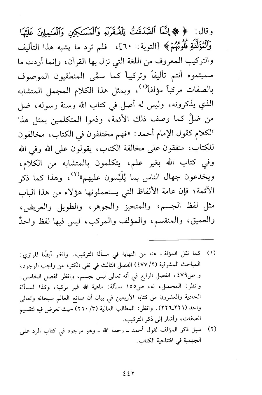وقال إِنَّمَا الصَّدَقَاتُ لِلْفُقَرَاءِ وَالْمَسَاكِينِ وَالْعَامِلِينَ عَلَيْهَا وَالْمُؤَلَّفَةِ قُلُوبُهُمْ [التوبة 60] فلم ترد ما يشبه هذا التأليف والتركيب المعروف من اللغة التي نزل بها القرآن وإنما أرادت ما سميتموه أنتم تأليفاً وتركيباً كما سمَّى المنطقيون الموصوف بالصفات مركباً مؤلفاً وبمثل هذا الكلام المجمل المتشابه الذي يذكرونه وليس له أصل في كتاب الله وسنة رسوله ضل من ضلَّ كما وصف ذلك الأئمة وذموا المتكلمين بمثل هذا الكلام كقول الإمام أحمد فهم مختلفون في الكتاب مخالفون للكتاب متفقون على مخالفة الكتاب يقولون على الله وفي الله وفي كتاب الله بغير علم يتكلمون بالمتشابه من الكلام ويخدعون جهال الناس بما يُلَبِّسون عليهم وهذا كما ذكر الأئمة فإن عامة الألفاظ التي يستعملونها هؤلاء من هذا الباب مثل لفظ الجسم والمتحيز والجوهر والطويل والعريض والعميق والمنقسم والمؤلف والمركب ليس فيها لفظ واحدٌ