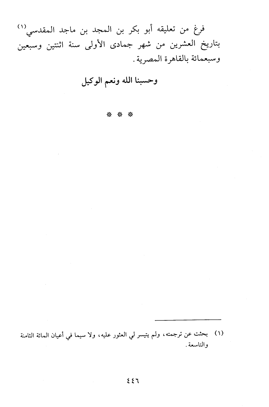 فرغ من تعليقه أبو بكر بن المجد بن ماجد المقدسي بتاريخ العشرين من شهر جمادى الأولى سنة اثنتين وسبعين وسبعمائة بالقاهرة المصرية وحسبنا الله ونعم الوكيل