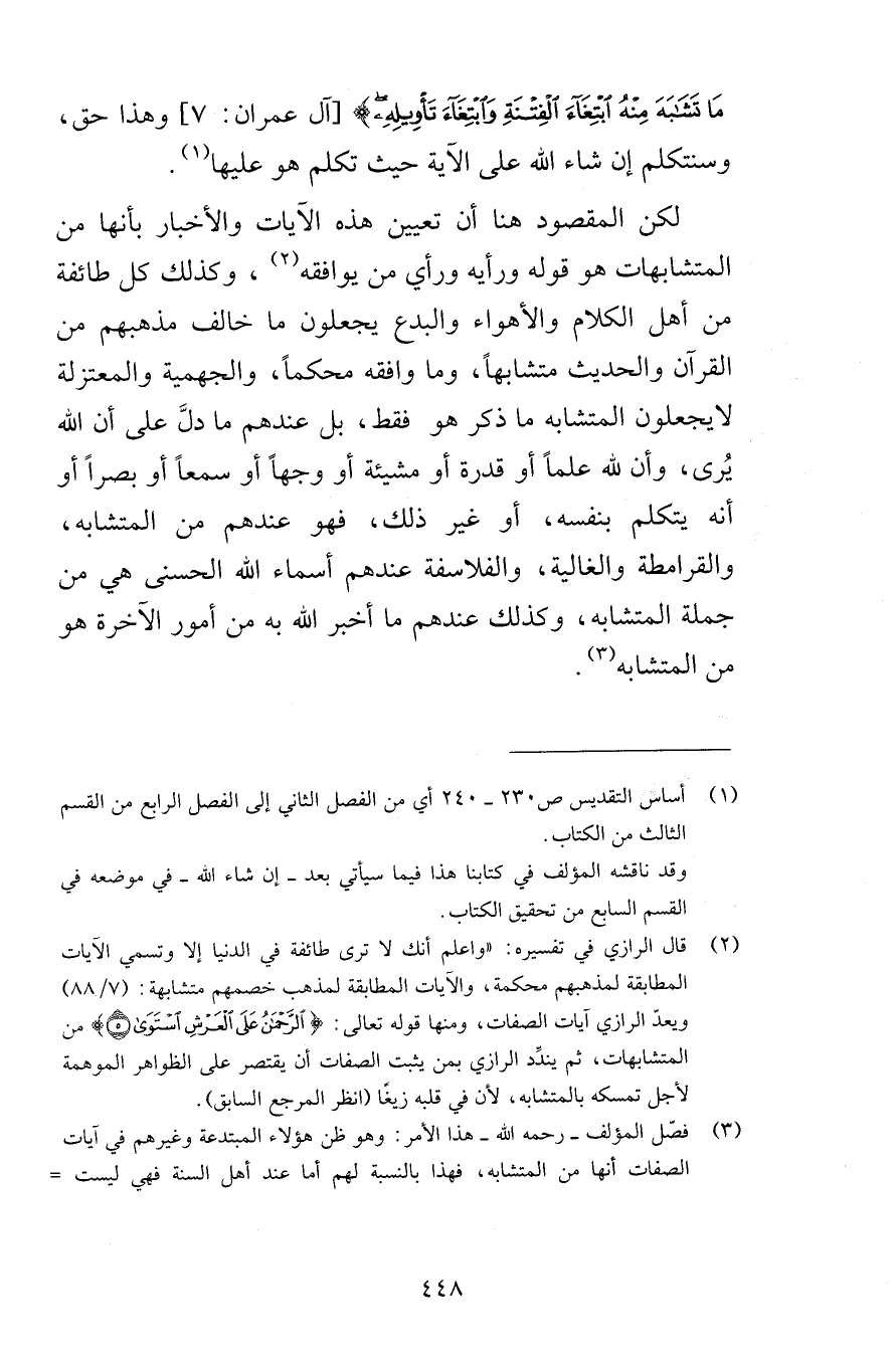 مَا تَشَابَهَ مِنْهُ ابْتِغَاءَ الْفِتْنَةِ وَابْتِغَاءَ تَأْوِيلِهِ [آل عمران 7] وهذا حق وسنتكلم إن شاء الله على الآية حيث تكلم هو عليها لكن المقصود هنا أن تعيين هذه الآيات والأخبار بأنها من المتشابهات هو قوله ورأيه ورأي من يوافقه وكذلك كل طائفة من أهل الكلام والأهواء والبدع يجعلون ما خالف مذهبهم من القرآن والحديث متشابهاً وما وافقه محكماً والجهمية والمعتزلة لايجعلون المتشابه ما ذكر هو فقط بل عندهم ما دلَّ على أن الله يُرى وان لله علماً أو قدرة أو مشيئة أو وجهاً أو سمعاً أو بصراً أو أنه يتكلم بنفسه أو غير ذلك فهو عندهم من المتشابه والقرامطة والغالية والفلاسفة عندهم أسماء الله الحسنى هي من جملة المتشابه وكذلك عندهم ما أخبر الله به من أمور الآخرة هو من المتشابه