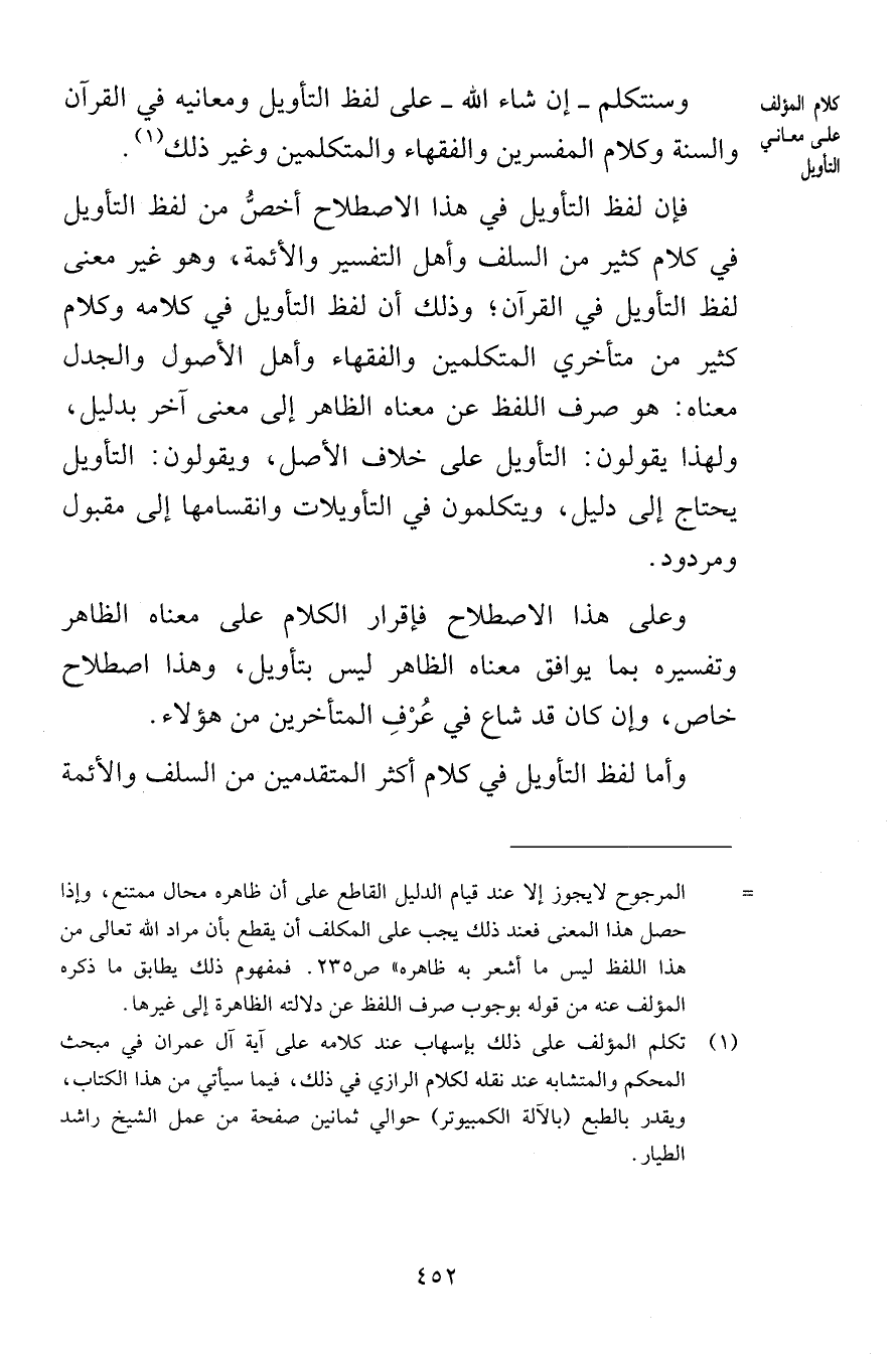 وسنتكلم إن شاء الله على لفظ التأويل ومعانيه في القرآن والسنة وكلام المفسرين والفقهاء والمتكلمين وغير ذلك فإن لفظ التأويل في هذا الاصطلاح أخصُّ من لفظ التأويل في كلام كثير من السلف وأهل التفسير والأئمة وهو غير معنى لفظ التأويل في القرآن وذلك أن لفظ التأويل في كلامه وكلام كثير من متأخري المتكلمين والفقهاء وأهل الأصول والجدل معناه هو صرف اللفظ عن معناه الظاهر إلى معنى آخر بدليل ولهذا يقولون التأويل على خلاف الأصل ويقولون التأويل يحتاج إلى دليل ويتكلمون في التأويلات وانقسامها إلى مقبول ومردود وعلى هذا الاصطلاح فإقرار الكلام على معناه الظاهر وتفسيره بما يوافق معناه الظاهر ليس بتأويل وهذا اصطلاح خاص وإن كان قد شاع في عُرْفِ المتأخرين من هؤلاء وأما لفظ التأويل في كلام أكثر المتقدمين من السلف والأئمة