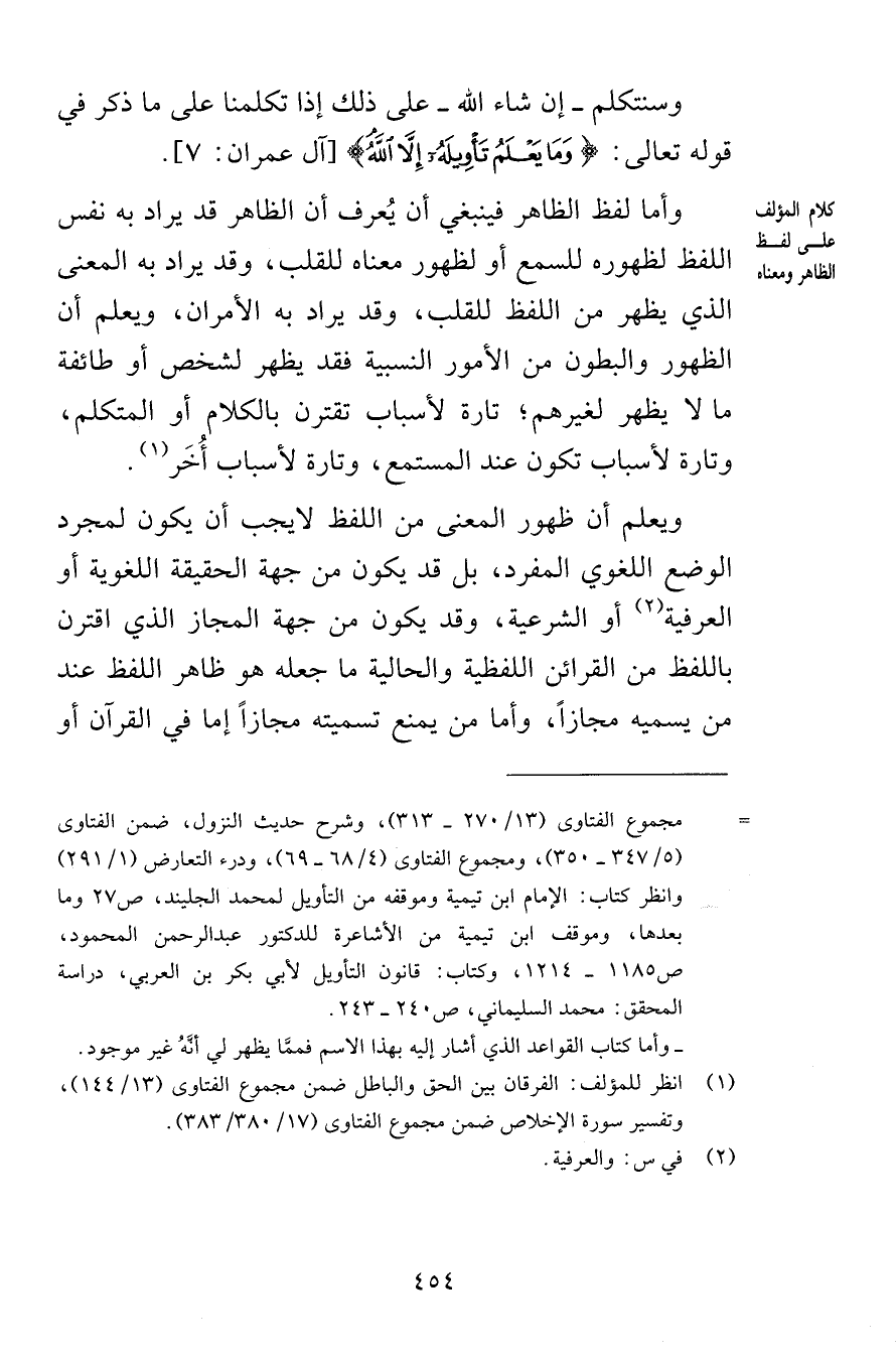 وسنتكلم إن شاء الله على ذلك إذا تكلمنا على ما ذكر في قوله تعالى وَمَا يَعْلَمُ تَأْوِيلَهُ إِلَّا اللَّهُ [آل عمران 7] وأما لفظ الظاهر فينبغي أن يُعرف أن الظاهر قد يراد به نفس اللفظ لظهوره للسمع أو لظهور معناه للقلب وقد يراد به المعنى الذي يظهر من اللفظ للقلب وقد يراد به الأمران ويعلم أن الظهور والبطون من الأمور النسبية فقد يظهر لشخص أو طائفة ما لا يظهر لغيرهم تارة لأسباب تقترن بالكلام أو المتكلم وتارة لأسباب تكون عند المستمع وتارة لأسباب لأُخَر ويعلم أن ظهور المعنى من اللفظ لايجب أن يكون لمجرد الوضع اللغوي المفرد بل قد يكون من جهة الحقيقة اللغوية أو العرفية أو الشرعية وقد يكون من جهة المجاز الذي اقترن باللفظ من القرائن اللفظية والحالية ما جعله هو ظاهر اللفظ عند من يسميه مجازاً وأما من يمنع تسميته مجازاً إما في القرآن أو