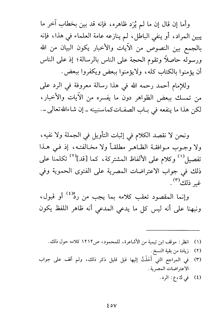وأما إن قال ما لم يُرَد ظاهره فإنه قد بين بخطاب آخر ما يبين المراد أو ينفي الباطل لم ينازعه عامة العلماء في هذا فإنه بالجمع بين النصوص من الآيات والأخبار يكون البيان من الله ورسوله حاصلاً وتقوم الحجة على الناس بالرسالة إذ على الناس أن يؤمنوا بالكتاب كله ولايؤمنوا ببعض ويكفروا ببعض وللإمام أحمد رحمه الله في هذا رسالة معروفة في الرد على من تمسك ببعض الظواهر دون ما يفسره من الآيات والأخبار لكن هذا ما ينفعه في باب الصفات كما سنبينه إن شاء الله تعالى ونحن لا نقصد الكلام في إثبات التأويل في الجملة ولا نفيه ولا وجوب موافقة الظاهر مطلقاً ولا مخالفته إذ في هذا تفصيل وكلام على الألفاظ المشتركة كما قد تكلمنا على ذلك في جواب الاعتراضات المصرية على الفتوى الحموية وفي غير ذلك وإنما المقصود تعقب كلامه بما يجب من ردٍّ أو قبول ونبهنا على أنه ليس كل ما يدعي المدعي أنه ظاهر اللفظ يكون
