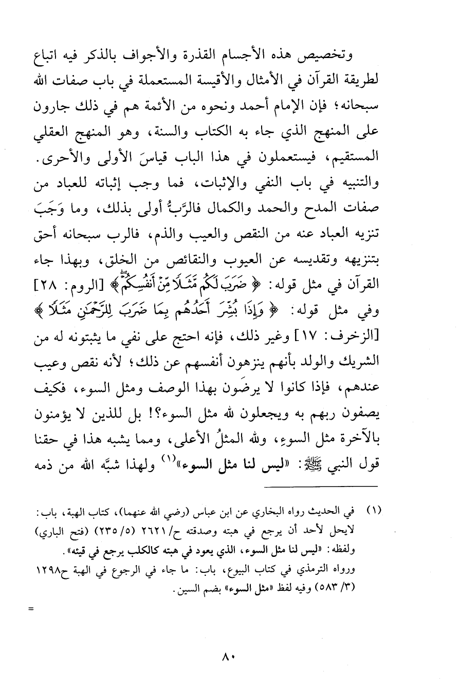 وتخصيص هذه الأجسام القذرة والأجواف بالذكر فيه اتباع لطريقة القرآن في الأمثال والأقيسة المستعملة في باب صفات الله سبحانه فإن الإمام أحمد ونحوه من الأئمة هم في ذلك جارون على المنهج الذي جاء به الكتاب والسنة وهو المنهج العقلي المستقيم فيستعملون في هذا الباب قياسَ الأولى والأحرى والتنبيه في باب النفي والإثبات فما وجب إثباته للعباد من صفات المدح والحمد والكمال فالرَّبُّ أولى بذلك وما وَجَبَ تنزيه العباد عنه من النقص والعيب والذم فالرب سبحانه أحق بتنزيهه وتقديسه عن العيوب والنقائص من الخلق وبهذا جاء القرآن في مثل قوله ضَرَبَ لَكُم مَّثَلاً مِنْ أَنفُسِكُمْ [الروم 28] وفي مثل قوله وَإِذَا بُشِّرَ أَحَدُهُم بِمَا ضَرَبَ لِلرَّحْمَنِ مَثَلاً [الزخرف 17] وغير ذلك فإنه احتج على نفي ما يثبتونه له من الشريك والولد بأنهم ينزهون أنفسهم عن ذلك لأنه نقص وعيب عندهم فإذا كانوا لا يرضَون بهذا الوصف ومثل السوء فكيف يصفون ربهم به ويجعلون لله مثل السوء بل للذين لا يؤمنون بالآخرة مثل السوءِ ولله المثلُ الأعلى ومما يشبه هذا في حقنا قول النبي صلى الله عليه وسلم ليس لنا مثل السوء ولهذا شبَّه الله من ذمه