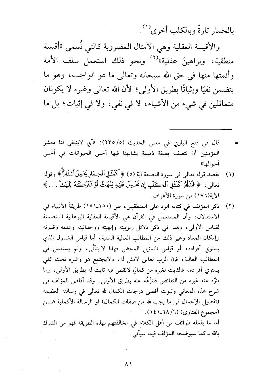 بالحمار تارةً وبالكلب أخرى والأقيسة العقلية وهي الأمثال المضروبة كالتي تُسمى أقيسة منطقية وبراهينَ عقلية ونحو ذلك استعمل سلف الأمة وأئمتها منها في حق الله سبحانه وتعالى ما هو الواجب وهو ما يتضمن نفيًا وإثباتًا بطريق الأولى لأن الله تعالى وغيره لا يكونان متماثلين في شيء من الأشياء لا في نفي ولا في إثبات بل ما