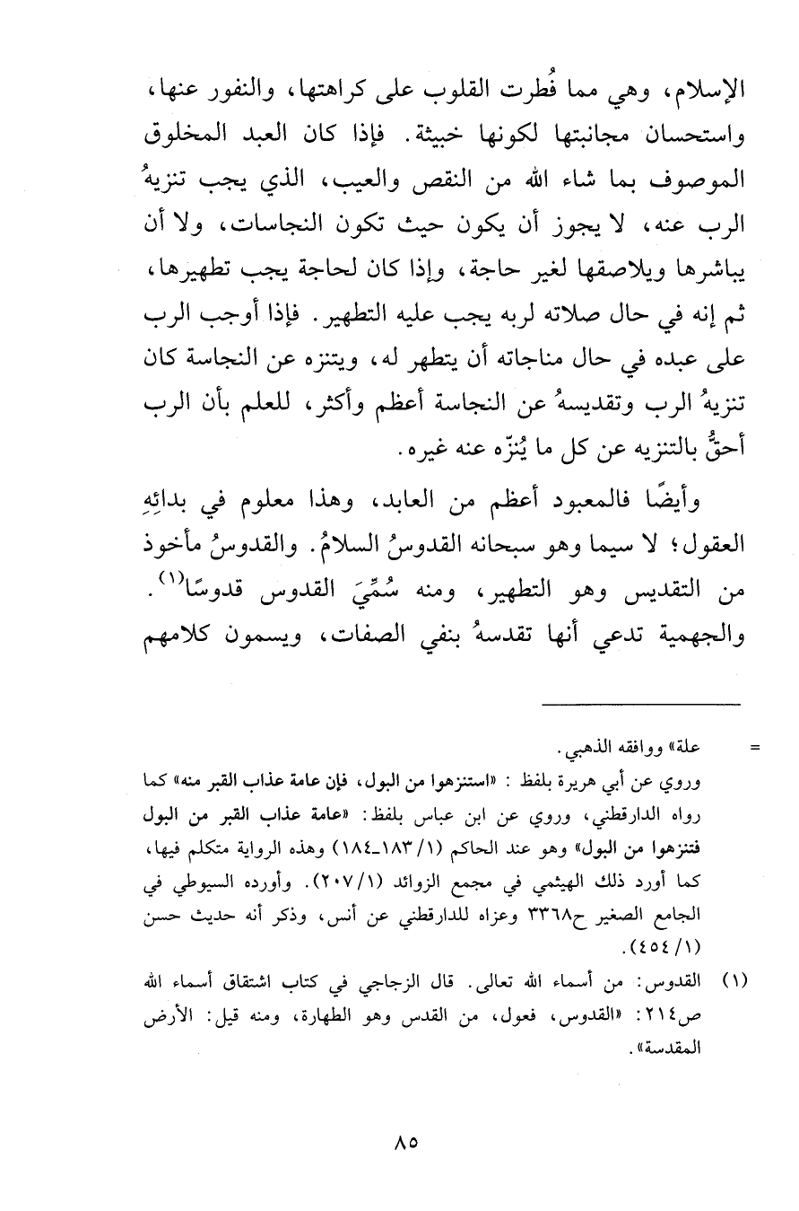 الإسلام وهي فُطرت القلوب على كراهتها والنفور عنها واستحسان مجانبتها لكونها خبيثة فإذا كان العبد المخلوق الموصوف بما شاء الله من النقص والعيب الذي يجب تنزيهُ الرب عنه لا يجوز أن يكون حيث تكون النجاسات ولا أن يباشرها ويلاصقها لغير حاجة وإذا كان لحاجة يجب تطهيرها ثم إنه في حال صلاته لربه يجب عليه التطهير فإذا أوجب الرب على عبده في حال مناجاته أن يتطهر له ويتنزه عن النجاسة كان تنزيهُ الرب وتقديسهُ عن النجاسة أعظم وأكثر للعلم بأن الرب أحقُّ بالتنزيه عن كل ما يُنزّه عنه غيره وأيضًا فالمعبود أعظم من العابد وهذا معلوم في بدائِهِ العقول لا سيما وهو سبحانه القدوسُ السلامُ والقدوسُ مأخوذ من التقديس وهو التطهير ومنه سُمِّيَ القدوس قدوسًا والجهمية تدعي أنها تقدسهُ بنفي الصفات ويسمون كلامهم