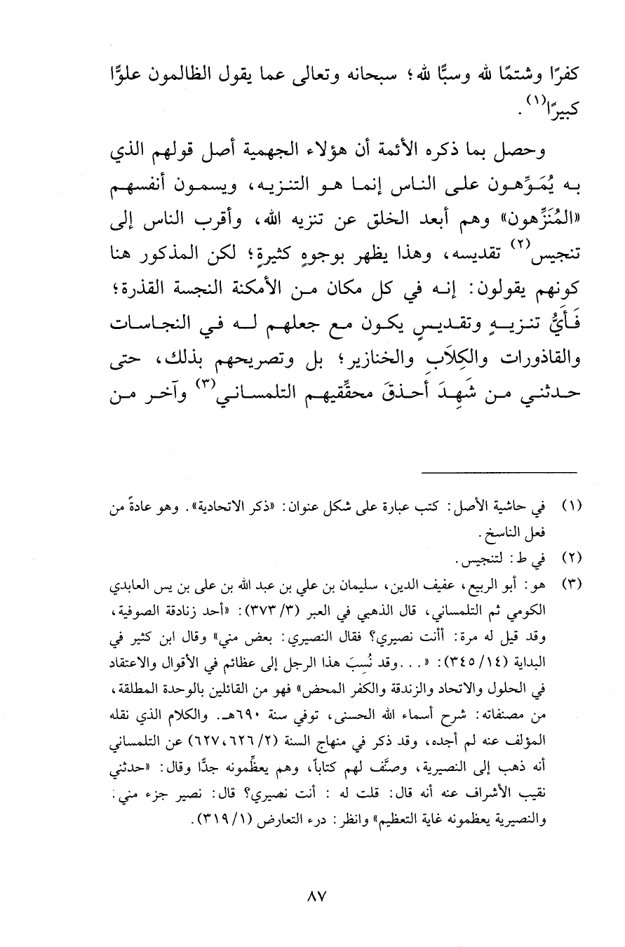 كفرًا وشتمًا لله وسبًّا لله وسبحانه وتعالى عما يقول الظالمون علوًّا كبيرًا وحصل بما ذكره الأئمة أن هؤلاء الجهمية هم أصل قولهم الذي به يُمَوِّهون على الناس إنما هو التنزيه ويسمون أنفسهم المُنَزِّهون وهم أبعد الخلق عن تنزيه الله وأقرب الناس إلى تنجيس تقديسه وهذا يظهر بوجوهٍ كثيرةٍ لكن المذكور هنا كونهم يقولون إنه في كل مكان من الأمكنة النجسة القذرة فَأَيُّ تنزيهٍ وتقديسٍ يكون مع جعلهم له في النجاسات والقاذورات والكِلاَبِ والخنازير بل وتصريحهم بذلك حتى حدثني من شَهِدَ أحذقَ محقِّقيهم التلمساني وآخر من