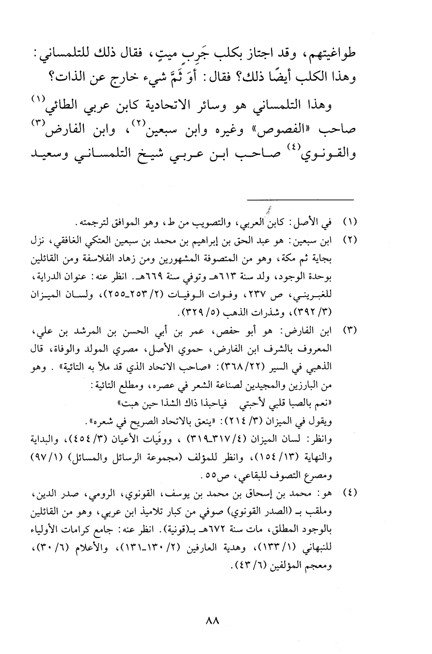 طواغيتهم وقد اجتاز بكلب جربٍ ميتٍ فقال ذلك للتلمساني وهذا الكلب أيضًا ذلك فقال أوَ ثَمَّ شيء خارج عن الذات وهذا التلمساني هو وسائر الاتحادية كابن عربي الطائي صاحب الفصوص وغيره وابن سبعين وابن الفارض والقونوي صاحب ابن عربي شيخ التلمساني وسعيد