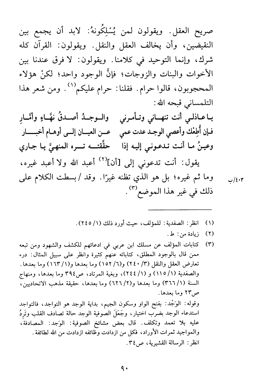 صريح العقل ويقولون لمن يُسْلِكُونهُ لابد أن يجمع بين النقيضين وأن يخالف العقل والنقل ويقولون القرآن كله شرك وإنما التوحيد في كلامنا ويقولون لا فرق عندنا بين الأخوات والبنات والزوجات فإنَّ الوجود واحد لكنْ هؤلاء المحجوبون قالوا حرام فقلنا حرام عليكم ومن شعر هذا التلمساني قبحه الله يا عاذلي أنت تنهاني وتأمرني والوجدُ أصدقُ نهَّاءٍ وأمَّارٍ فإن أُطِعْك وأعصى الوجد عدمت عمي عن العيان إلى أوهام أخبار وعينُ ما أنت تدعوني إليه إذا حقَّقته تره المنهيَّ يا جاري يقول أنت تدعوني إلى أن أعبد الله ولا أعبد غيره وما ثم غيره بل هو الذي تظنه غيرًا وقد بسطت الكلام على ذلك في غير هذا الموضع