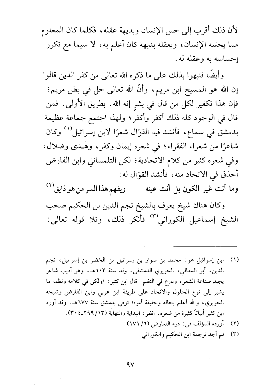 لأن ذلك أقرب إلى حس الإنسان وبديهة عقله فكلما كان المعلوم مما يحسه الإنسان ويعقله بديهة كان أعلم به لا سيما مع تكرر إحساسه به وعقله له وأيضًا فنبهوا بذلك على ما ذكره الله تعالى من كفر الذين قالوا إن الله هو المسيح ابن مريم وأنّ الله تعالى حل في بطن مريم فإن هذا تكفير لكل من قال في بشرٍ إنه الله بطريق الأولى فمن قال في الوجود كله ذلك أكفر وأكفر ولهذا اجتمع جماعة عظيمة بدمشق في سماع فأنشد فيه القوّال شعرًا لابن إسرائيل وكان شاعرًا من شعراء الفقراء في شعره إيمان وكفر وهدى وضلال وفي شعره كثير من كلام الاتحادية لكن التلمساني وابن الفارض أحذق في الاتحاد منه فأنشد القوّال له وما أنت غير الكون بل أنت عينه ويفهم هذا السر من هو ذايق وكامن هناك شيخ يعرف بالشيخ نجم الدين بن الحكيم صحب الشيخ إسماعيل الكوراني فأنكر ذلك وتلا قوله تعالى