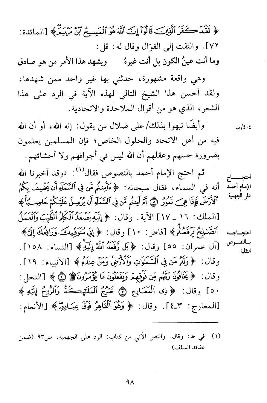لَقَدْ كَفَرَ الَّذِينَ قَالُواْ إِنَّ اللَّهَ هُوَ الْمَسِيحُ ابْنُ مَرْيَمَ [المائدة 72] والتفت إلى القوّال وقال له قل وما أنت عينُ الكون بل أنت غيرهُ ويشهد هذا الأمر من هو صادق وهي واقعة مشهورة حدثني بها غير واحد ممن شهدها ولقد أحسن هذا الشيخ التالي لهذه الآية في الرد على هذا الشعر الذي هو من أقوال الملاحدة والاتحادية وأيضًا نبهوا بذلك على ضلال من يقول إنه الله أو أن الله فيه من أهل الاتحاد والحلول الخاص فإن المسلمين يعلمون بضرورة حسهم وعقلهم أن الله ليس في أجوافهم ولا أحشائهم ثم احتج الإمام أحمد بالنصوص فقال وقد أخبرنا الله أنه في السماء فقال سبحانه أَأَمِنتُم مَّن فِي السَّمَاء أَن يَخْسِفَ بِكُمُ الأَرْضَ فَإِذَا هِيَ تَمُورُ {16} أَمْ أَمِنتُم مَّن فِي السَّمَاء أَن يُرْسِلَ عَلَيْكُمْ حَاصِباً [الملك 16-17] الآية وقال إِلَيْهِ يَصْعَدُ الْكَلِمُ الطَّيِّبُ وَالْعَمَلُ الصَّالِحُ يَرْفَعُهُ [فاطر 10] وقال إِنِّي مُتَوَفِّيكَ وَرَافِعُكَ إِلَيَّ [آل عمران 55] وقال بَل رَّفَعَهُ اللهُ إِلَيْهِ [النساء 158] وقال وَلَهُ مَن فِي السَّمَاوَاتِ وَالْأَرْضِ وَمَنْ عِندَهُ [الأنبياء 19] وقال يَخَافُونَ رَبَّهُم مِّن فَوْقِهِمْ وَيَفْعَلُونَ مَا يُؤْمَرُونَ {50} [النحل 50] وقال ذِي الْمَعَارِجِ {3} تَعْرُجُ الْمَلَائِكَةُ وَالرُّوحُ إِلَيْهِ [المعارج 3-4] وقال وَهُوَ الْقَاهِرُ فَوْقَ عِبَادِهِ [الأنعام