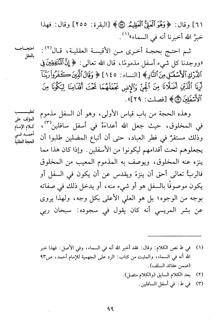 61] وقال وَهُوَ الْعَلِيُّ الْعَظِيمُ {255} [البقرة 255] وقال فهذا خبرُ الله أخبرنا أنه في السماء ثم احتج بحجة أخرى من الأقيسة العقلية قال ووجدنا كل شيء أسفل مذمومًا قال الله تعالى إِنَّ الْمُنَافِقِينَ فِي الدَّرْكِ الأَسْفَلِ مِنَ النَّارِ [النساء 145] وَقَالَ الَّذِينَ كَفَرُوا رَبَّنَا أَرِنَا الَّذَيْنِ أَضَلَّانَا مِنَ الْجِنِّ وَالْإِنسِ نَجْعَلْهُمَا تَحْتَ أَقْدَامِنَا لِيَكُونَا مِنَ الْأَسْفَلِينَ {29} [فصلت 29] وهذه الحجة من باب قياس الأولى وهو أن السفل مذموم في المخلوق حيث جعل الله أعداءَهُ في أسفل سافلين وذلك مستقرٌ في فطر العباد حتى أن أتباع المضلين طلبوا أن يجعلوهم تحت أقدامهم ليكونوا من الأسفلين وإذا كان هذا مما ينزه عنه المخلوق ويوصف به المذموم المعيب من المخلوق فالربُّ تعالى أحق أن ينزهَ ويقدس عن أن يكون في السفل أو يكون موصوفًا بالسفل هو أو شيء منه أو يدخل ذلك في صفاته بوجه من الوجوه بل هو العلي الأعلى بكل وجه ولهذا يروى عن بشر المريسي أنه كان يقول في سجوده سبحان ربي