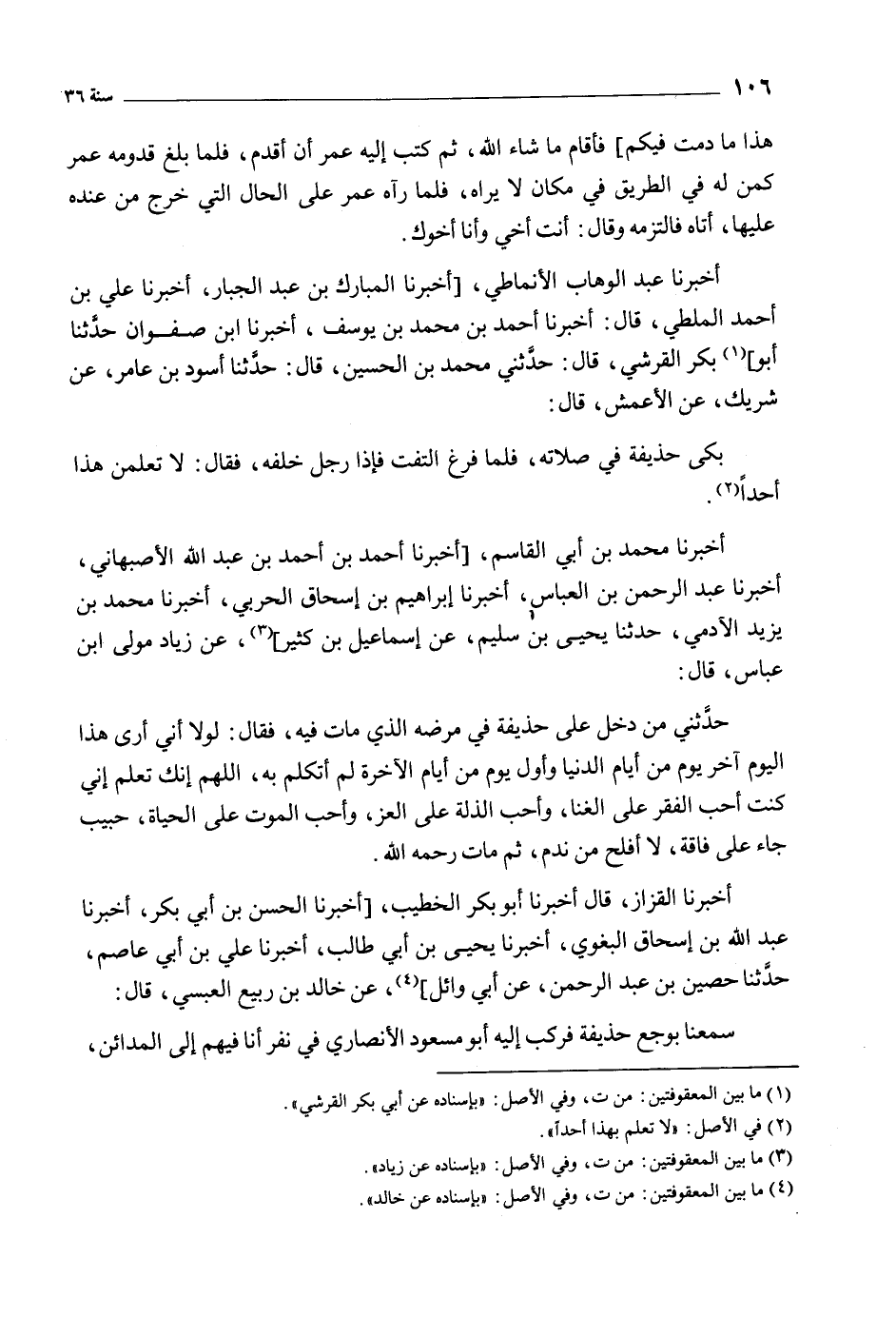 أَخْبَرَنَا الْقَزَّازُ، قَالَ أَخْبَرَنَا أَبُو بَكْرٍ الْخَطِيبُ، [أَخْبَرَنَا الْحَسَنُ بْنُ أَبِي بَكْرٍ، أَخْبَرَنَا عَبْدُ اللَّهِ بْنُ إِسْحَاقَ الْبَغَوِيُّ، أَخْبَرَنَا يَحْيَى بْنُ أَبِي طَالِبٍ، أَخْبَرَنَا عَلِيُّ بْنُ أَبِي عَاصِمٍ، حَدَّثَنَا حُصَيْنُ بْنُ عَبْدِ الرَّحْمَنِ، عَنْ أَبِي وَائِلٍ] [4] ، عَنْ خَالِدِ بْنِ رَبِيعٍ الْعَبْسِيِّ، قَالَ: