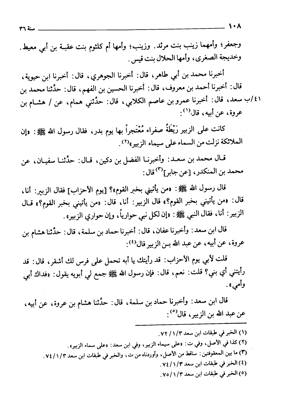 أَخْبَرَنَا مُحَمَّدُ بْنُ أَبِي طَاهِرٍ، قَالَ: أَخْبَرَنَا الْجَوْهَرِيُّ، قال: أخبرنا ابن حيوية، قال: أخبرنا أحمد بن معروف، قال: أخبرنا الحسين بن الفهم، قال: حدّثنا محمد بن 41/ ب سَعْدٍ، قَالَ: أَخْبَرَنَا عَمْرُو بْنُ عَاصِمٍ الْكِلابِيُّ، قَالَ: حَدَّثَنِي هَمَّامٌ، عَنْ/ هِشَامِ بْنِ عُرْوَةَ، عَنْ أَبِيهِ، قَالَ [1] : كَانَتْ عَلَى الزُّبَيْرِ رِيطَةٌ صَفْرَاءُ مُعْتَجِرًا بِهَا يَوْمَ بَدْرٍ، فَقَالَ رَسُولُ اللَّهِ صَلَّى اللَّهُ عَلَيْهِ وَسَلَّمَ: «إِنَّ الْمَلائِكَةَ نَزَلَتْ مِنَ السَّمَاءِ عَلَى سِيمَاءِ الزُّبَيْرِ» [2] . قَالَ مُحَمَّدُ بْنُ سَعْدٍ: وَأَخْبَرَنَا الْفَضْلُ بْنُ دُكَيْنٍ، قَالَ: حَدَّثَنَا سُفْيَانُ، عَنْ مُحَمَّدِ بْنِ الْمُنْكَدِرِ، [عَنْ جَابِرِ] [3] قَالَ: قَالَ رَسُولُ اللَّهِ صَلَّى اللَّهُ عَلَيْهِ وَسَلَّمَ: «مَنْ يَأْتِينِي بِخَبَرِ الْقَوْمِ» ؟ [يَوْمَ الأَحْزَابِ] فَقَالَ الزُّبَيْرُ: أَنَا، قَالَ: «مَنْ يَأْتِينِي بِخَبَرِ الْقَوْمِ؟» قَالَ الزُّبَيْرُ: أَنَا، قَالَ: «مَنْ يَأْتِينِي بِخَبَرِ الْقَوْمِ؟» قَالَ الزُّبَيْرُ: أَنَا، فَقَالَ النَّبِيُّ صَلَّى اللَّهُ عَلَيْهِ وَسَلَّمَ: «إِنَّ لكل نبي حواريا، وإن حواري الزبير» . قَالَ ابْنُ سَعْدٍ: وَأَخْبَرَنَا عَفَّانُ، قَالَ: أَخْبَرَنَا حَمَّادُ بْنُ سَلَمَةَ، قَالَ: حَدَّثَنَا هِشَامُ بْنُ عُرْوَةَ، عَنْ أَبِيهِ، عَنْ عَبْدِ اللَّهِ بْنِ الزُّبَيْرِ قَالَ [4] : قُلْتُ لأَبِي يَوْمَ الأَحْزَابِ: قَدْ رَأَيْتُكَ يَا أَبَهْ تَحْمِلُ عَلَى فَرَسٍ لَكَ أَشْقَرَ، قَالَ: قَدْ رَأَيْتَنِي أَيْ بُنَيَّ؟ قُلْتُ: نَعَمْ، قَالَ: فَإِنَّ رَسُولَ اللَّهِ صَلَّى اللَّهُ عَلَيْهِ وَسَلَّمَ جَمَعَ لِي أَبَوَيْهِ يَقُولُ: «فِدَاكَ أَبِي وَأُمِّي» . قَالَ ابْنُ سَعْدٍ: وَأَخْبَرَنَا حَمَّادُ بْنُ سَلَمَةَ، قَالَ: حَدَّثَنَا هِشَامُ بْنُ عُرْوَةَ، عَنْ أَبِيهِ، عَنْ عَبْدِ اللَّهِ بْنِ الزُّبَيْرِ، قال [5] :
