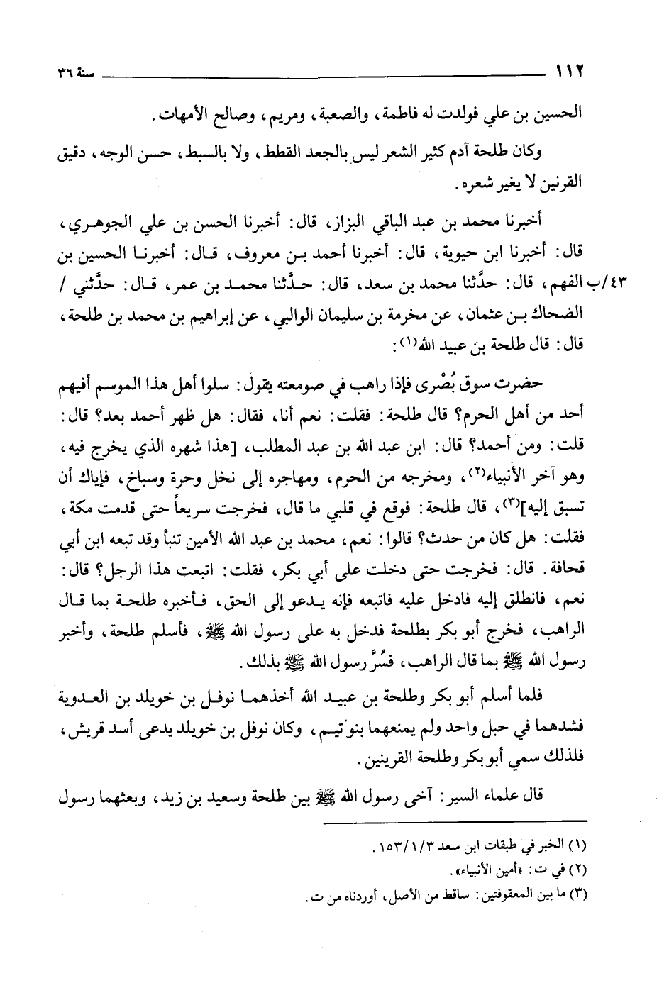 قُلْتُ: وَمَنْ أَحْمَدُ؟ قَالَ: ابْنُ عَبْدِ اللَّهِ بْنِ عَبْدِ الْمُطَّلِبِ، [هَذَا شَهْرُهُ الَّذِي يَخْرُجُ فِيهِ، وَهُوَ آَخِرُ الأَنْبِيَاءِ [2] ، وَمَخْرَجُهُ مِنَ الْحَرَمِ، وَمُهَاجَرُهُ إِلَى نَخْلٍ وَحَرَّةَ وَسَبَاخَ، فَإِيَّاكَ أَنْ تُسْبَقَ إِلَيْهِ] [3] ، قَالَ طَلْحَةُ: فَوَقَعَ فِي قَلْبِي مَا قَالَ، فَخَرَجْتُ سَرِيعًا حَتَّى قَدِمْتُ مَكَّةَ، فَقُلْتُ: هَلْ كَانَ مِنْ حَدَثٍ؟ قَالُوا: نَعَمْ، مُحَمَّدُ بْنُ عَبْدِ اللَّهِ الأَمِينُ تَنَبَّأَ وَقَدْ تَبِعَهُ ابْنُ أَبِي قُحَافَةَ. قَالَ: فَخَرَجْتُ حَتَّى دَخَلْتُ عَلَى أَبِي بَكْرٍ، فَقُلْتُ: اتَّبَعْتَ هَذَا الرَّجُلَ؟ قَالَ: