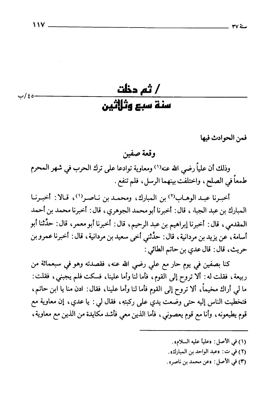 أَخْبَرَنَا عَبْدُ الْوَهَّابِ [2] بن المبارك، ومحمد بن ناصر [3] ، قالا: أَخْبَرَنَا المبارك بْن عَبْد الجبار، قال: أخبرنا أبو مُحَمَّدٍ الْجَوْهَرِيُّ، قَالَ: أَخْبَرَنَا مُحَمَّدُ بْنُ أَحْمَدَ الْمُقَدِّمِيُّ، قَالَ: أَخْبَرَنَا إِبْرَاهِيمُ بْنُ عَبْدِ الرَّحِيمِ، قَالَ: أَخْبَرَنَا أَبُو مَعْمَرٍ، قَالَ: حَدَّثَنَا أَبُو أُسَامَةَ، عَنْ يَزِيدَ بْنِ مَرْدَانِيَةَ، قَالَ: حَدَّثَنِي أَخِي سَعِيدُ بْنُ مَرْدَانِيَةَ، قَالَ: أَخْبَرَنَا عَمْرُو بْنُ حُرَيْثٍ، قَالَ: قَالَ عَدِيُّ بْنُ حَاتِمٍ الطَّائِيُّ: كُنَّا بِصِفِّينَ فِي يَوْمٍ حَارٍّ مَعَ عَلِيٍّ رَضِيَ اللَّهُ عَنْهُ، فَقَصَدَتْهُ وَهُوَ فِي سبعمائة مِنْ رَبِيعَةَ، فَقُلْتُ لَهُ: أَلا تَرُوحُ إِلَى الْقَوْمِ، فَإِمَّا لَنَا وَإِمَّا عَلَيْنَا، فَسَكَتَ فَلْم يُجِبْنِي، فَقُلْتُ: