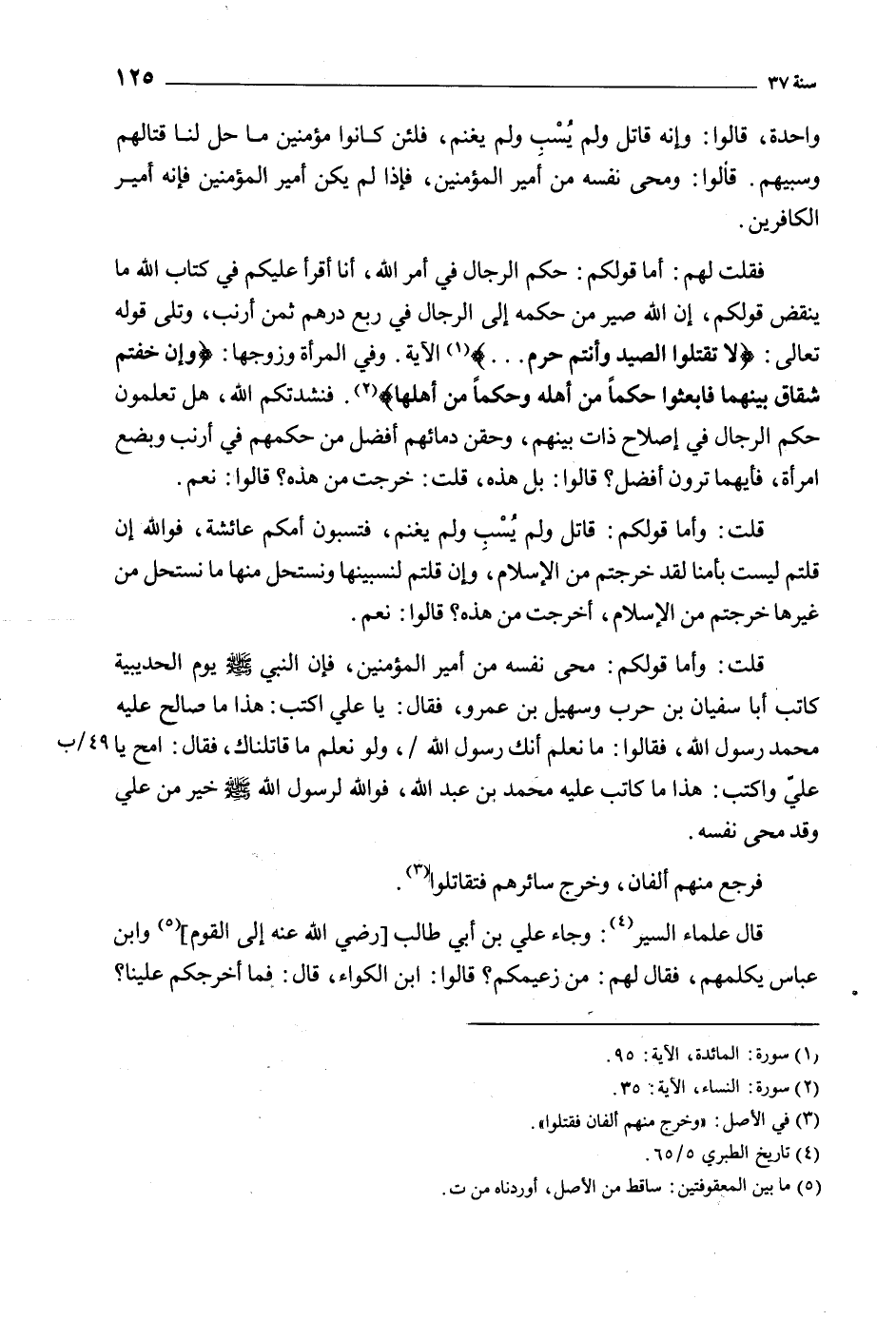 فَقُلْتُ لَهُمْ: أَمَّا قَوْلُكُمْ: حَكَّمَ الرِّجَالَ فِي أَمْرِ اللَّهِ، أَنَا أَقْرَأُ عَلَيْكُمْ فِي كِتَابِ اللَّهِ مَا يَنْقُضُ قَوْلَكُمْ، إِنَّ اللَّهَ صَيَّرَ مِنْ حُكْمِهِ إِلَى الرِّجَالِ فِي رُبُعِ دِرْهَمٍ ثَمَنَ أَرْنَبٍ، وَتَلَى قَوْلُهُ تَعَالَى: لا تَقْتُلُوا الصَّيْدَ وَأَنْتُمْ حُرُمٌ ... 5: 95 [1] الآيَةَ. وَفِي الْمَرْأَةِ وَزَوْجِهَا: وَإِنْ خِفْتُمْ شِقاقَ بَيْنِهِما فَابْعَثُوا حَكَماً مِنْ أَهْلِهِ وَحَكَماً مِنْ أَهْلِها 4: 35 [2] . فَنَشَدْتُكُمُ اللَّهَ، هَلْ تَعْلَمُونَ حُكْمَ الرِّجَالِ فِي إِصْلَاحِ ذَاتِ بَيْنِهِمْ، وَحَقْنِ دِمَائِهِمْ أَفْضَلَ مِنْ حُكْمِهِمْ فِي أَرْنَبٍ وَبُضْعِ امْرَأَةٍ، فَأَيُّهُمَا تَرَوْنَ أَفْضَلَ؟ قَالُوا: بَلْ هَذِهِ، قُلْتُ: خَرَجْتُ مِنْ هَذِهِ؟ قَالُوا: نَعَمْ.