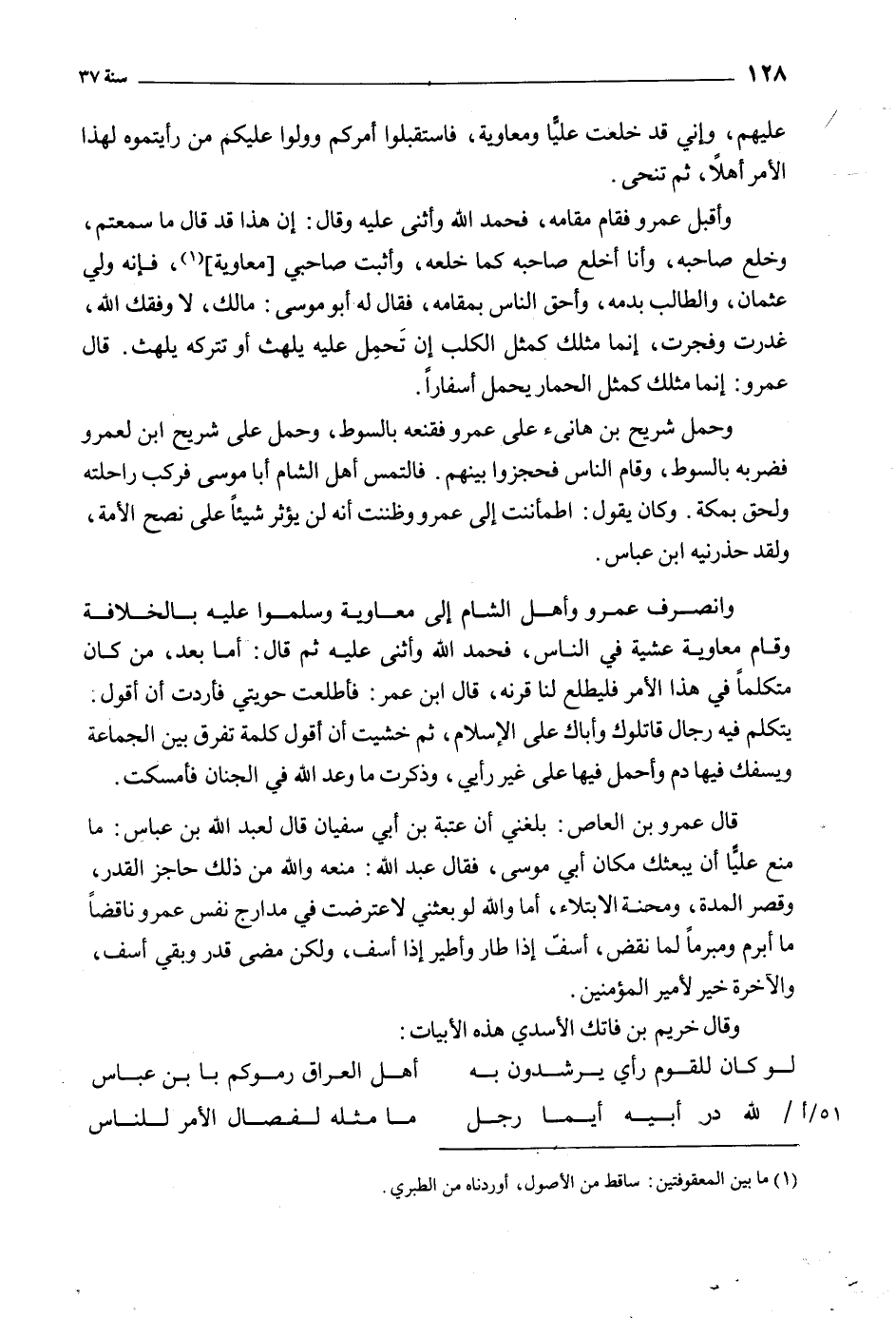 وأقبل عمرو فقام مقامه، فحمد الله وأثنى عليه وقَالَ: إن هذا قد قَالَ ما سمعتم، وخلع صاحبه، وأنا أخلع صاحبه كما خلعه، وأثبت صاحبي [معاوية] [1] ، فإنه ولي عثمان، والطالب بدمه، وأحق الناس بمقامه، فقَالَ له أبو مُوسَى: مالك، لا وفقك الله، غدرت وفجرت، إنما مثلك كمثل الكلب إن تحمل عليه يلهث أو تتركه يلهث. قَالَ عمرو: إنما مثلك كمثل الحمار يحمل أسفارا.