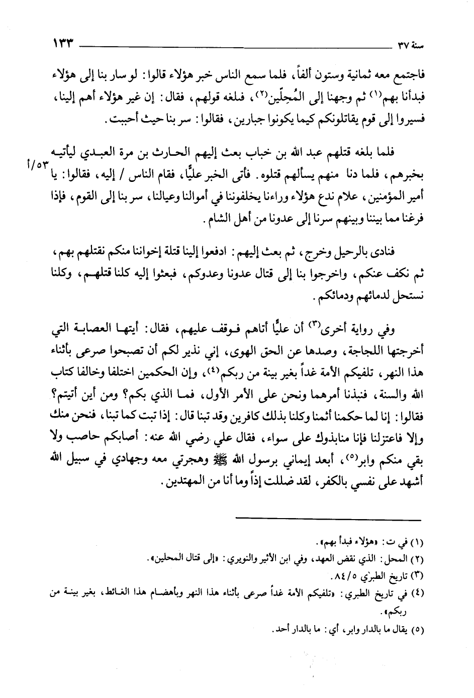 [4] في تاريخ الطبري: «تلفيكم الأمة غدا صرعى بأثناء هذا النهر وبأهضام هذا الغائط، بغير بينة من ربكم» .