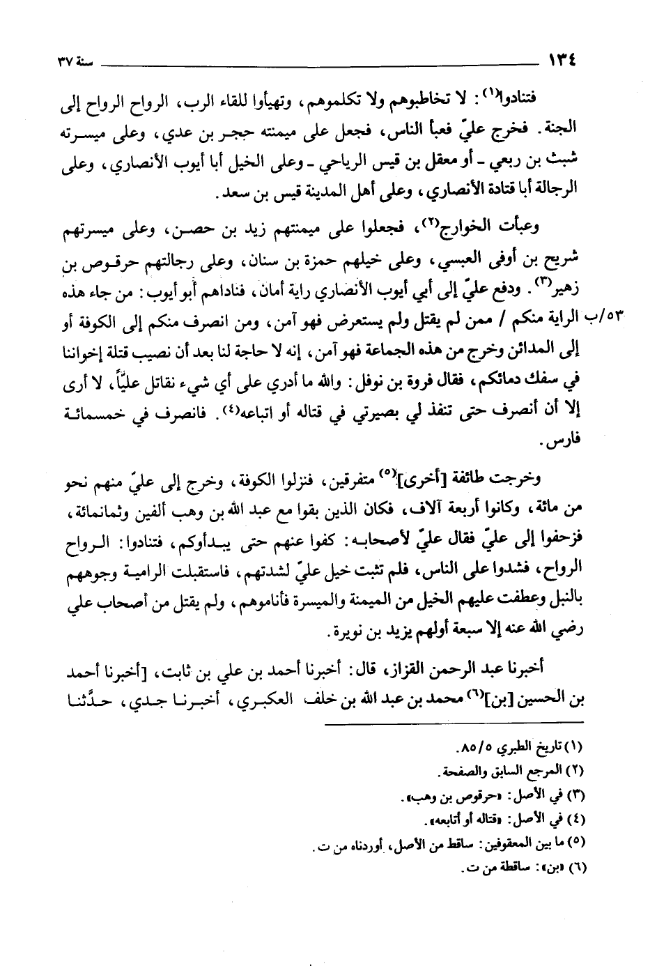 وعبأت الخوارج [2] ، فجعلوا على ميمنتهم زيد بن حصن، وعلى ميسرتهم شريح بن أوفى العبسي، وعلى خيلهم حمزة بن سنان، وعلى رجالتهم حرقوص بن زهير [3] . ودفع علي إلى أبي أيوب الأنصاري راية أمان، فناداهم أبو أيوب: من جاء هذه 53/ ب الراية منكم/ ممن لم يقتل ولم يستعرض فهو آمن، ومن انصرف منكم إلى الكوفة أو إلى المدائن وخرج من هذه الجماعة فهو آمن، إنه لا حاجة لنا بعد أن نصيب قتلة إخواننا فِي سفك دمائكم، فقال فروة بن نوفل: والله ما أدري على أي شيء نقاتل عليا، لا أرى إلا أن أنصرف حتى تنفذ لي بصيرتي فِي قتاله أو اتباعه [4] . فانصرف في خمسمائة فارس.